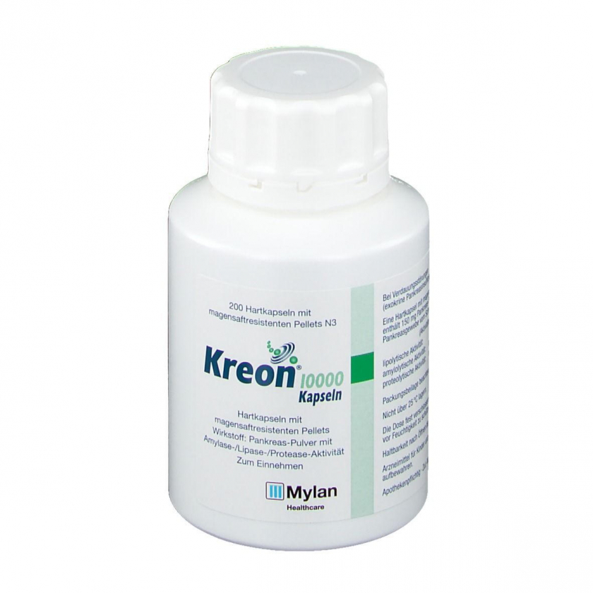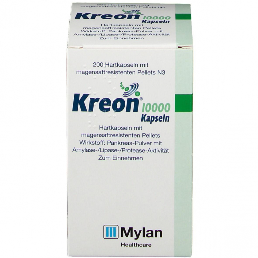 Kreon® 10 000 - ферментный препарат для заместительной терапии при недостаточности поджелудочной железы. Содержит панкреатические ферменты из свиной поджелудочной железы, помогающие перевариванию пищи. Применяется при муковисцидозе и других состояниях с нарушением пищеварения. Капсулы с кишечнорастворимыми пеллетами для постепенного высвобождения ферментов в кишечнике.