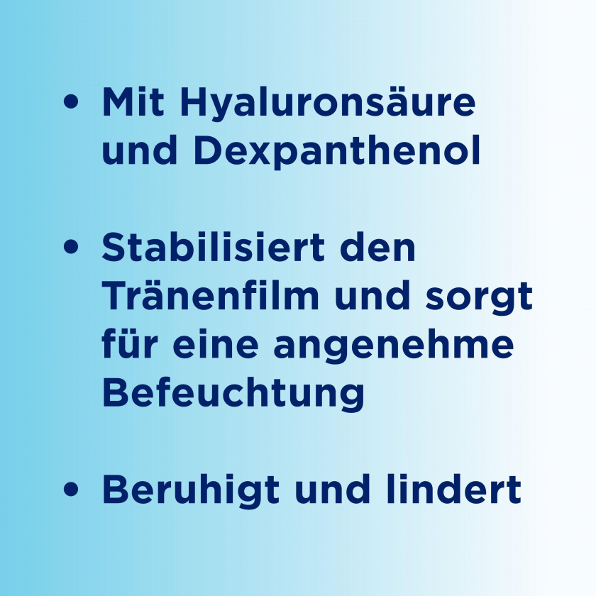 Глазные капли Bepanthen® для увлажнения и защиты глаз при сухости, покраснении, зуде и жжении. Содержат декспантенол и гиалуроновую кислоту, не содержат консервантов и фосфатов, подходят для носящих контактные линзы. Доступны в одноразовых контейнерах и многоразовых флаконах.