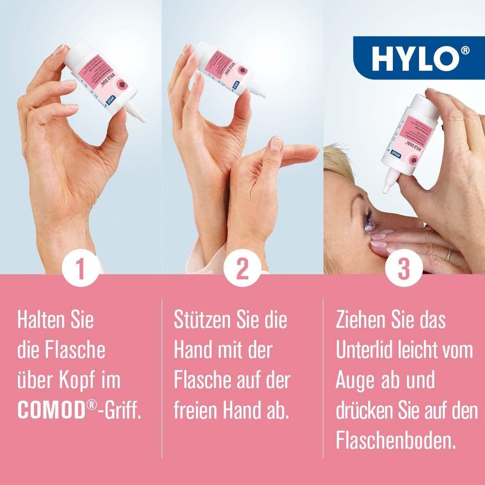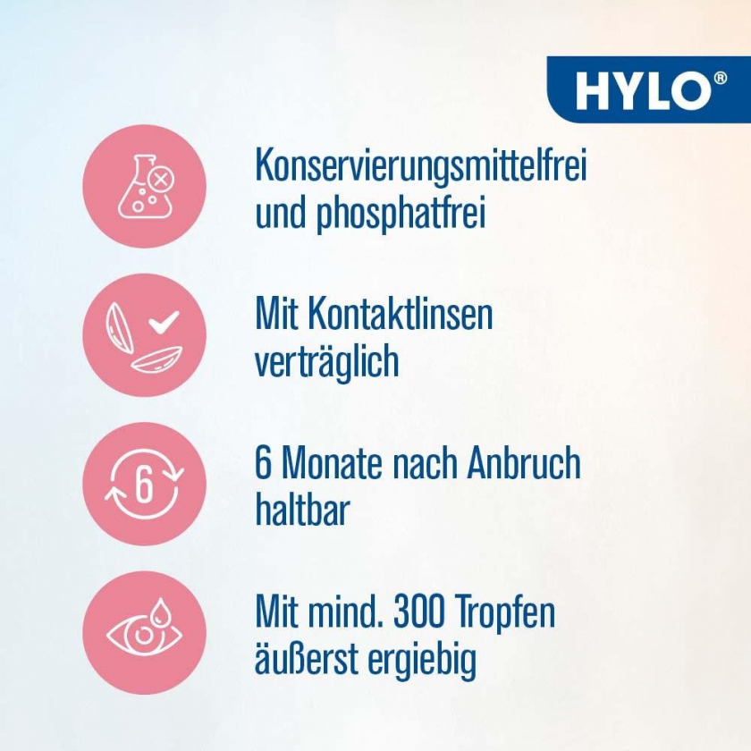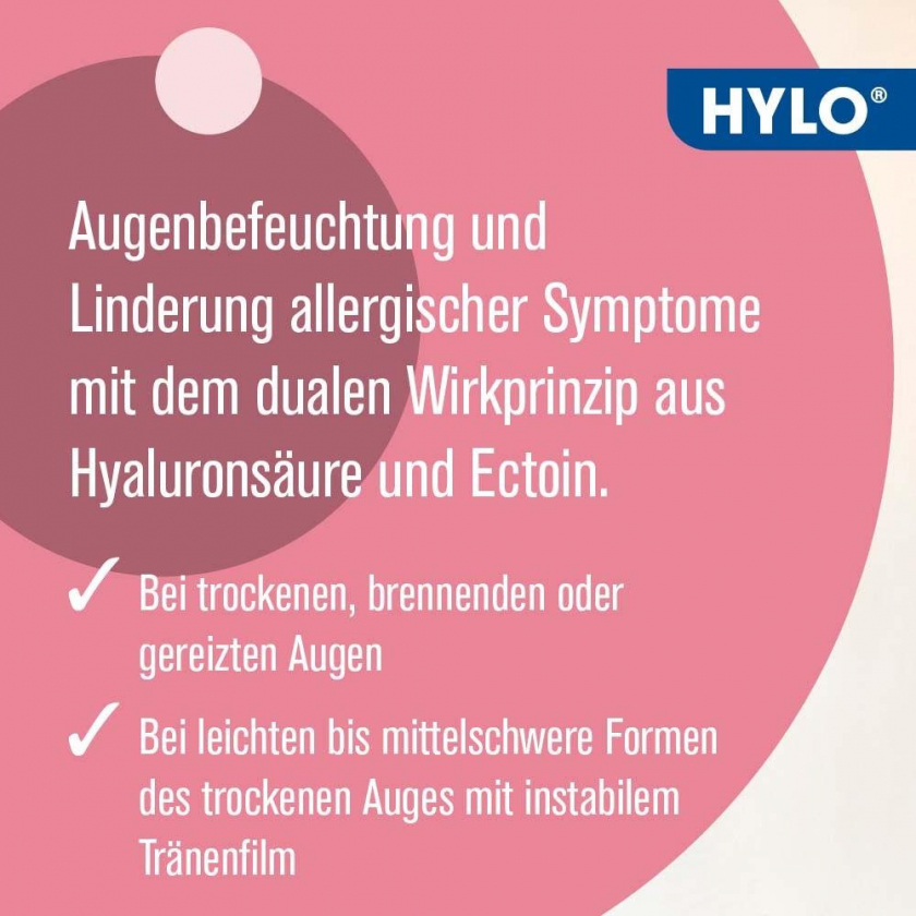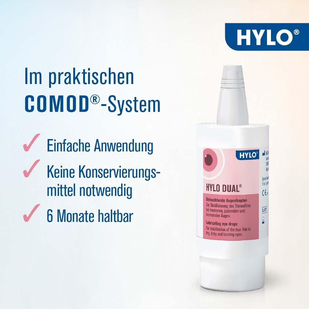 HYLO-DUAL® - увлажняющие глазные капли с двойным действием для лечения синдрома сухого глаза и аллергических реакций. Содержат гиалуроновую кислоту для длительного увлажнения и эктоин для защиты от раздражителей. Без консервантов и фосфатов, подходят для взрослых и детей от 6 лет.