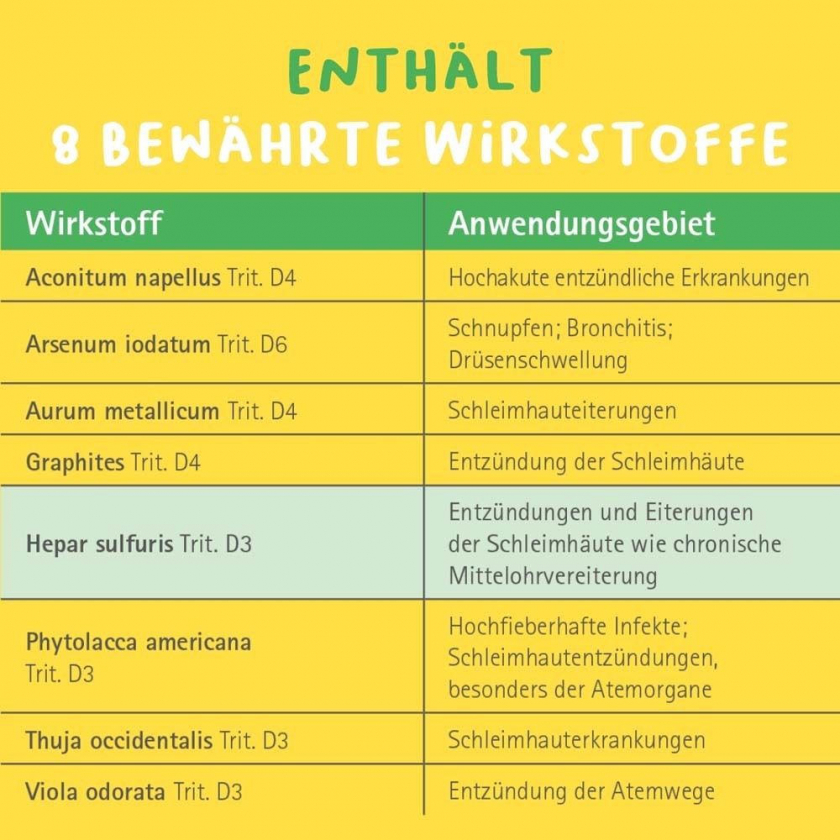 Действующие вещества: Aconitum napellus D4 25 мг, Phytolacca americana D3 50 мг, Thuja occidentalis D3 25 мг, Viola odorata D3 25 мг, Arsenum iodatum D6 25 мг, Hepar sulfuris D3 50 мг, Aurum metallicum D4 25 мг, Graphites D4 25 мг. Вспомогательные вещества: кальций бегенат, картофельный крахмал, лактоза-1-вода