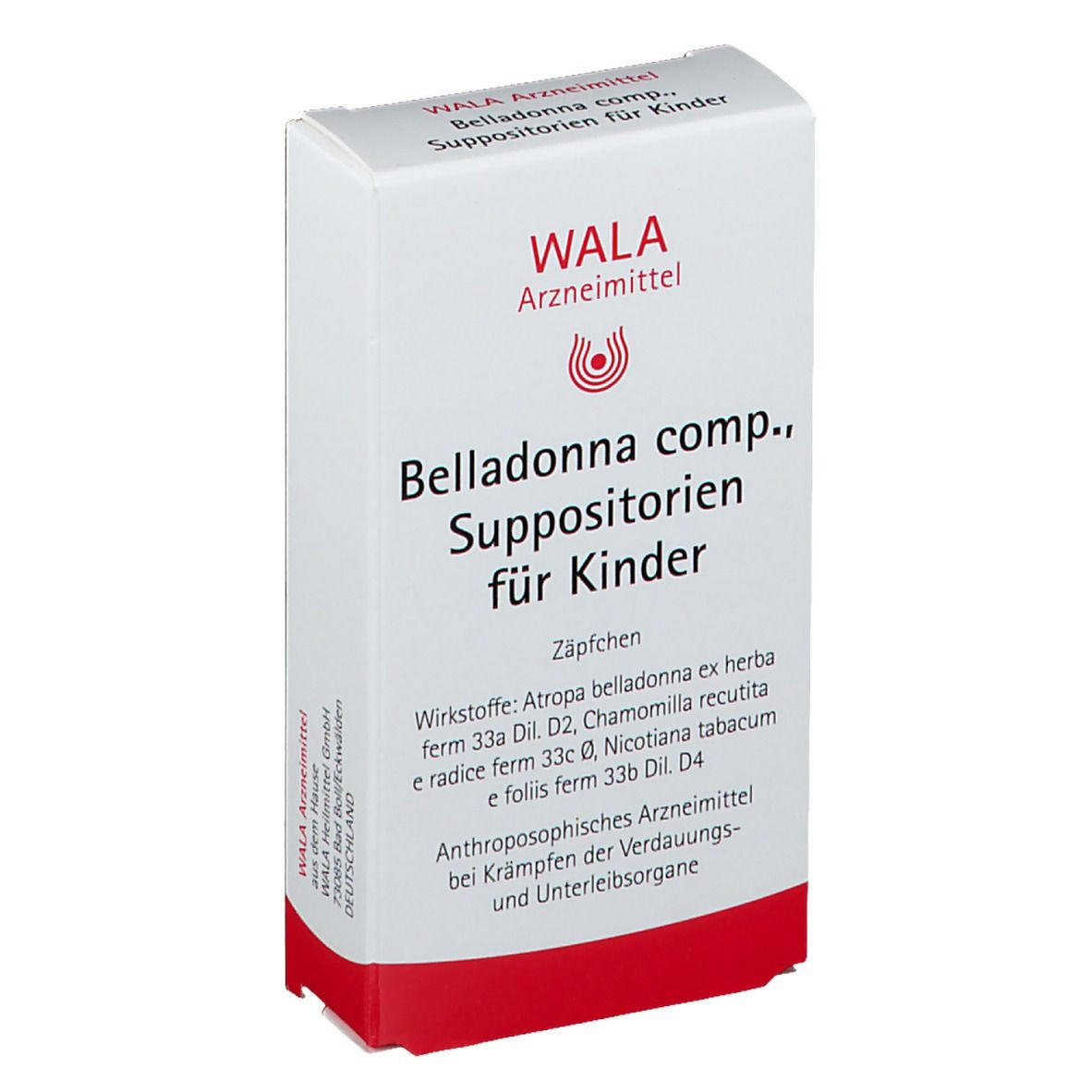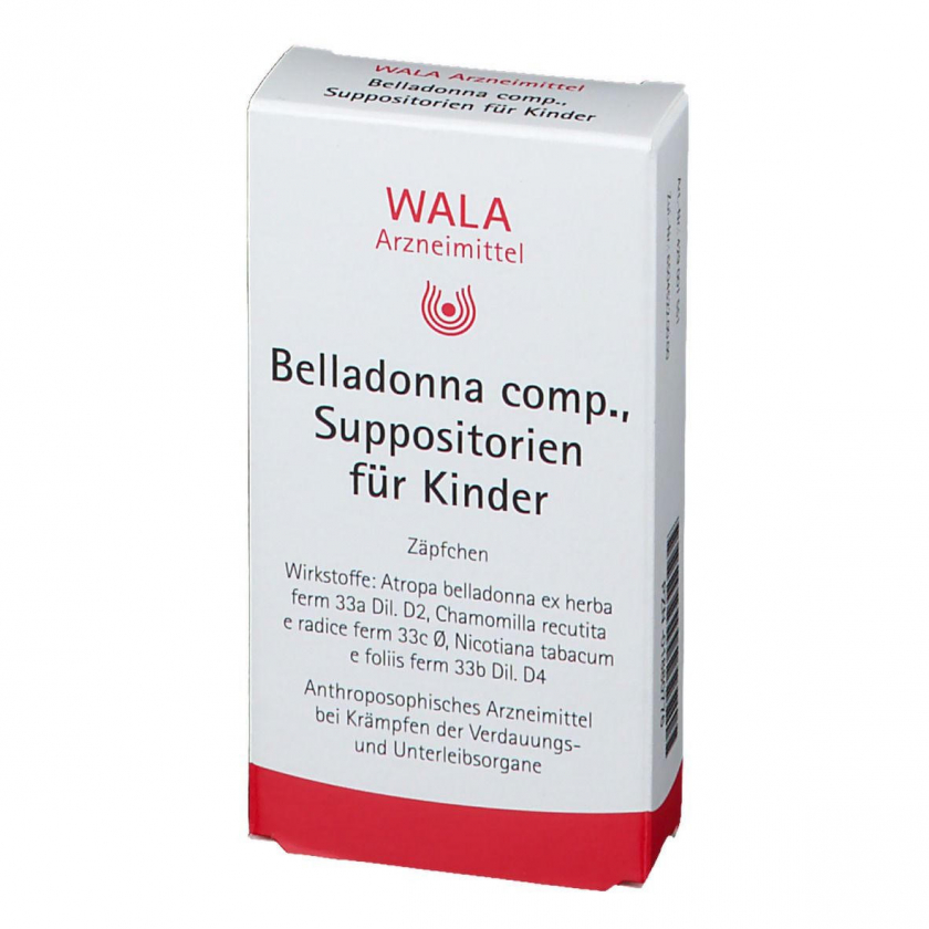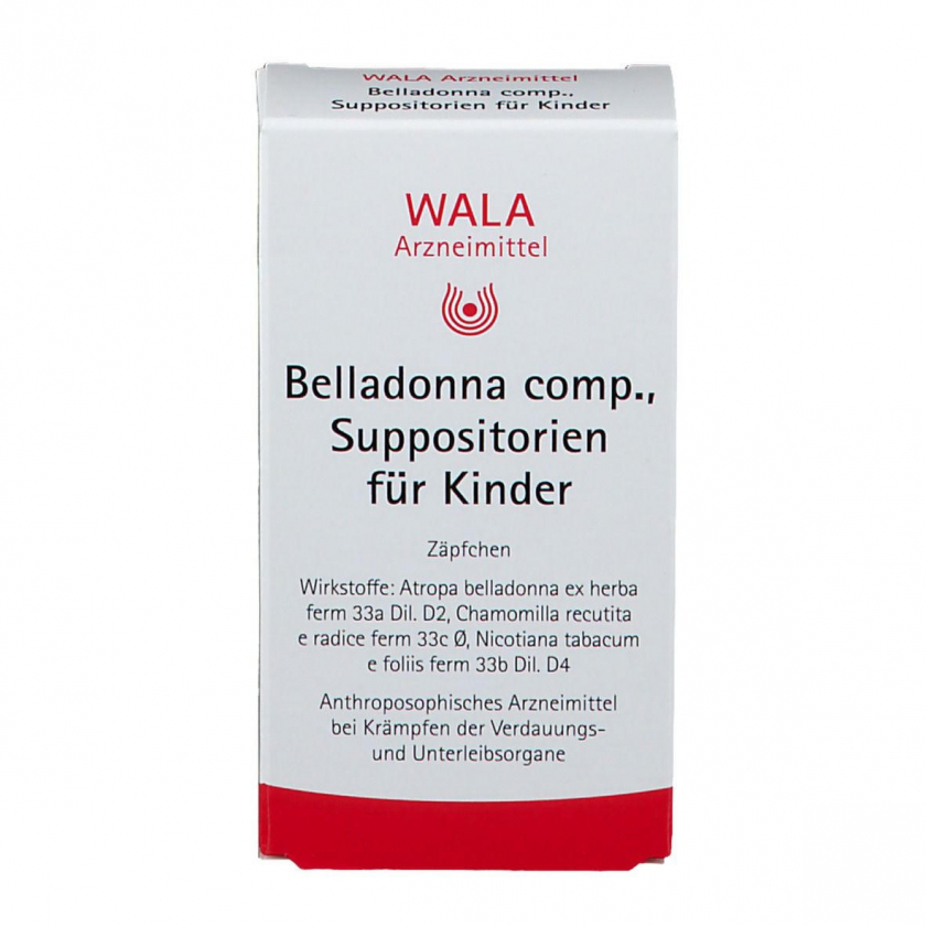 Гомеопатические детские суппозитории WALA® Belladonna Comp. для ректального применения. Содержат растительные компоненты: белладонну, ромашку и табак в гомеопатических разведениях. Без указания терапевтических показаний как гомеопатическое средство.