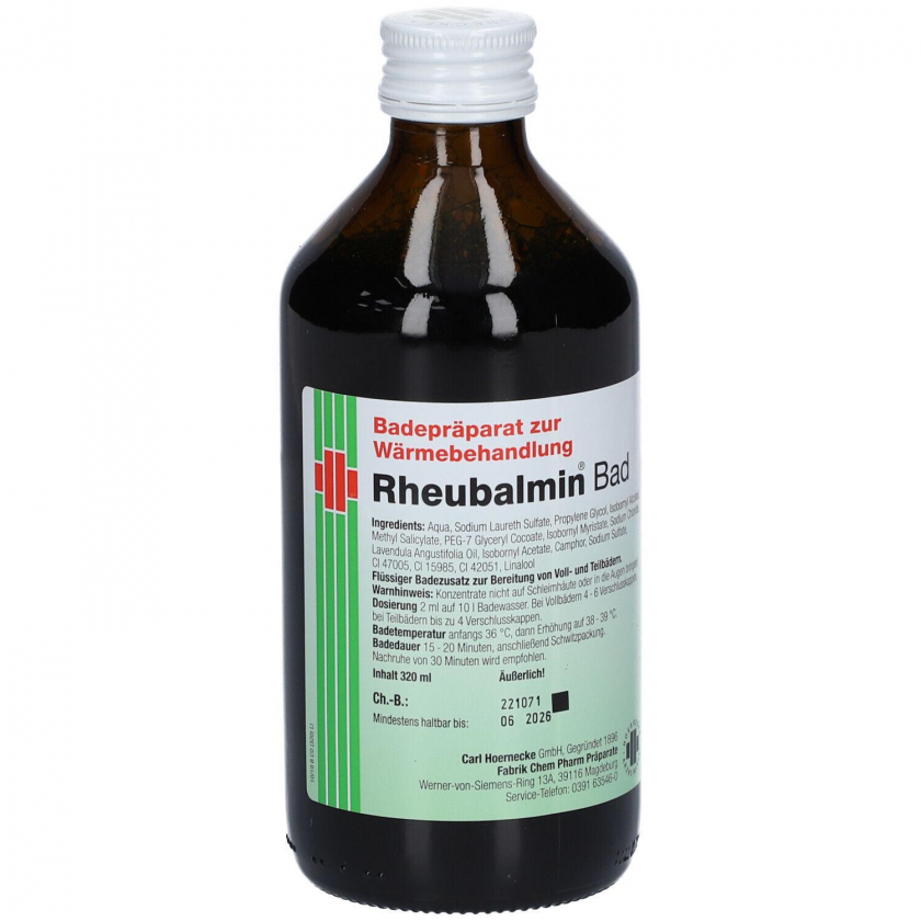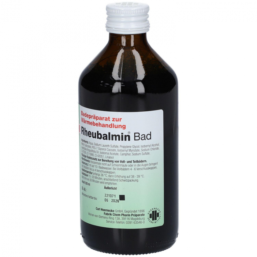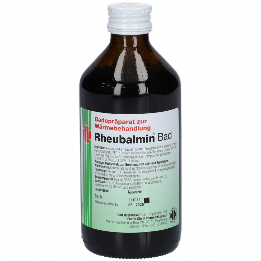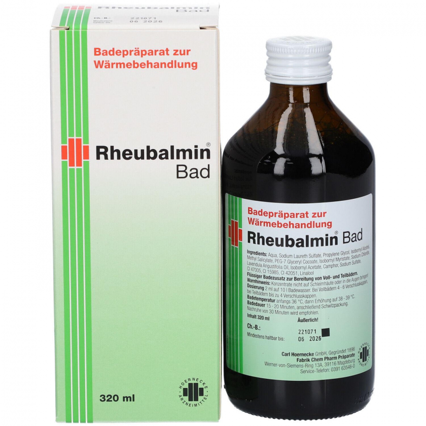 Лечебное средство для ванн Rheubalmin® Bad MED применяется при ревматических болях, артрите, ишиасе, люмбаго, мышечных напряжениях и растяжениях. Средство добавляется в ванну, создавая эффект относительной невесомости, что способствует расслаблению мышц, улучшению кровообращения и уменьшению боли. Используется более 75 лет в лечении заболеваний опорно-двигательного аппарата.