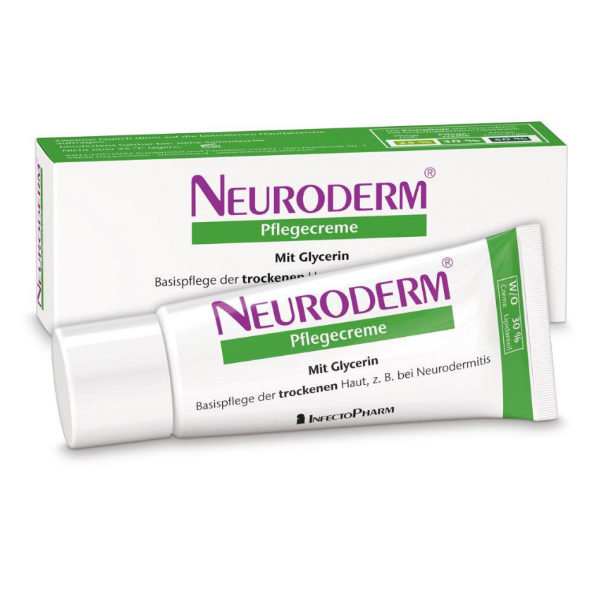 Neuroderm® Pflegecreme - лечебный крем для ухода за сухой кожей и базовой терапии при нейродермите. Содержит 30% липидов, глицерин и воду для восстановления липидного баланса и увлажнения кожи. Не содержит ланолин, подходит для людей с аллергией на шерстяной воск. Может использоваться в дополнение к лекарственным препаратам.