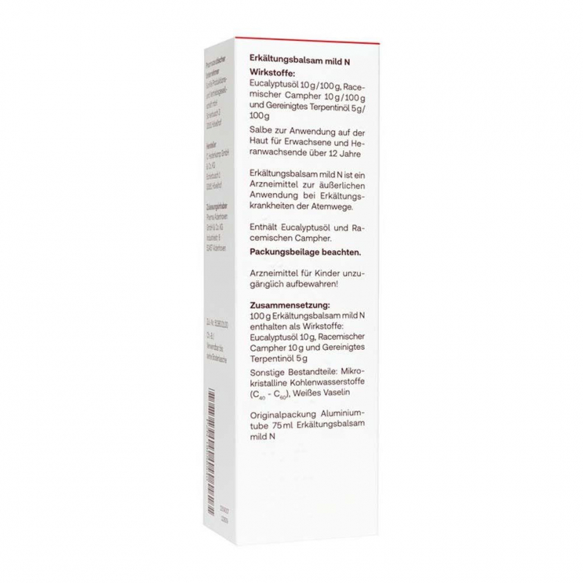 Redcare Erkältungsbalsam mild N - лекарственный бальзам для облегчения симптомов простудных заболеваний дыхательных путей с вязкой мокротой. Содержит эвкалиптовое масло, камфору и очищенное терпентинное масло. Подходит для подростков от 12 лет и взрослых. Наносится на грудь и спину 1-3 раза в день.