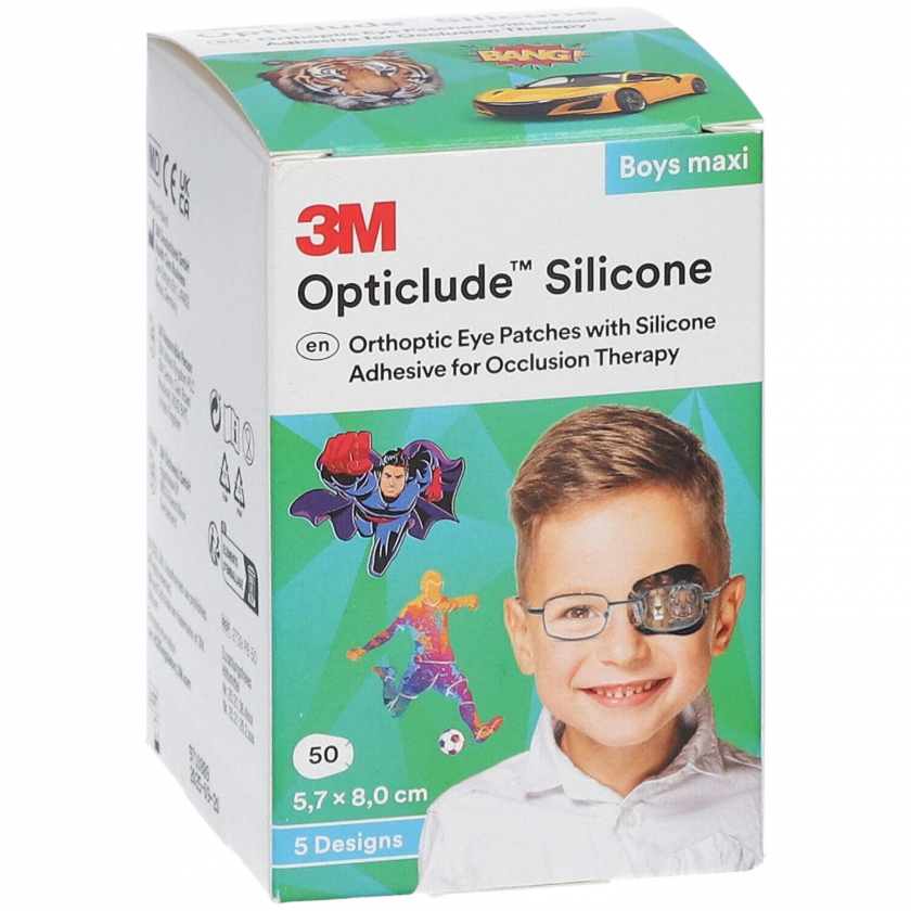 Глазной пластырь Opticlude 3M Silicone Boys maxi для окклюзионной терапии у детей от 6 лет. Размер 5,7 x 8 см с гипоаллергенным силиконовым клеем, мягкий и бережный для чувствительной кожи вокруг глаз.