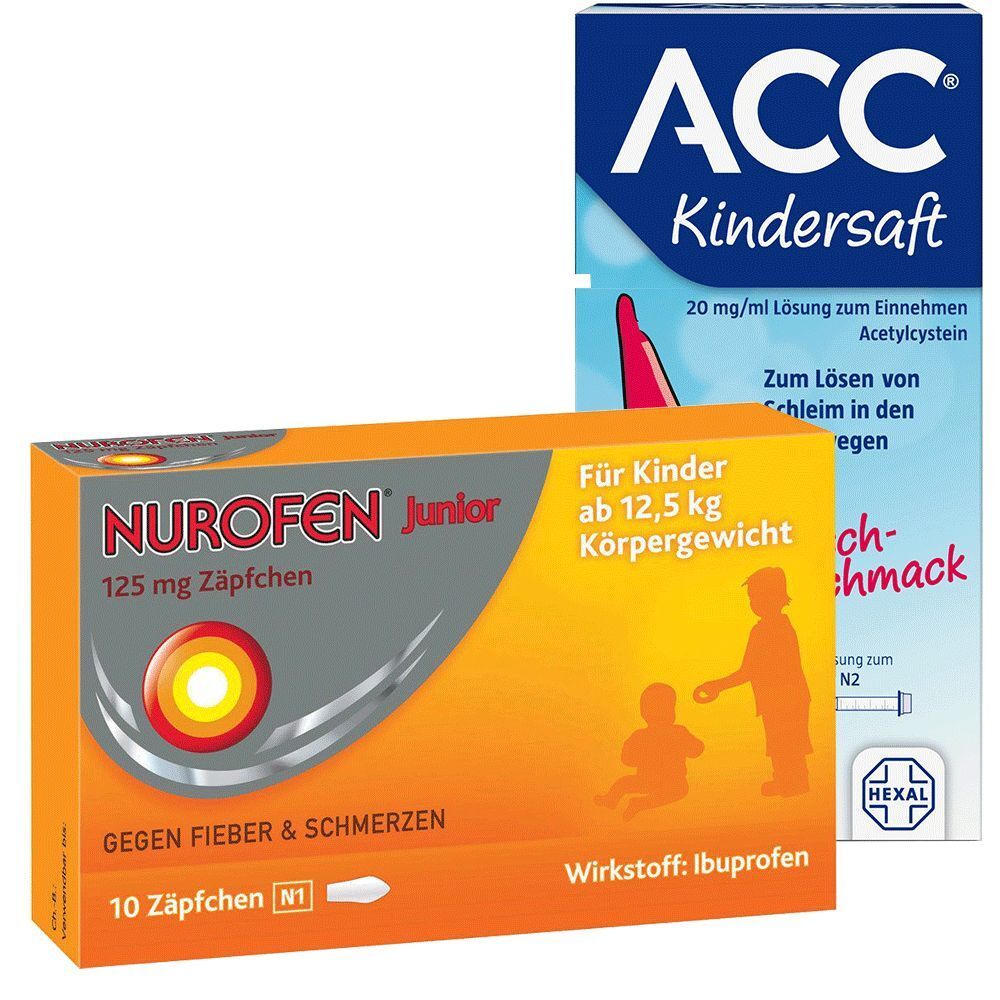 Набор детских лекарственных средств для лечения симптомов простуды: Nurofen® Junior 125 мг (свечи) для снижения температуры и обезболивания, и ACC® Kindersaft 20 мг/мл (сироп) для облегчения отхождения мокроты при кашле. Подходит для детей от 2 лет.