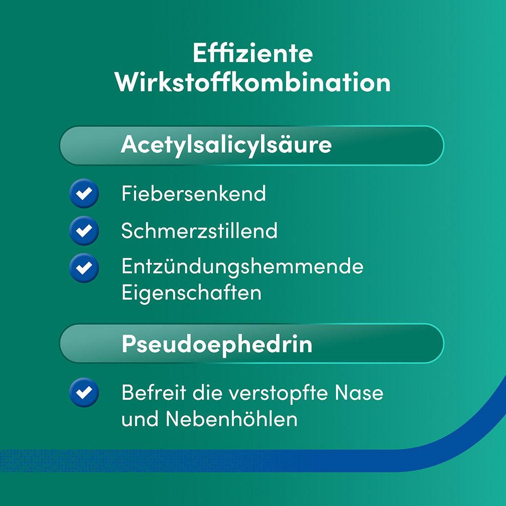 Состав: Ацетилсалициловая кислота 500 мг, псевдоэфедрина гидрохлорид 30 мг, изомальт, маннитол, лимонная кислота, сукралоза, ацесульфам калий, мальтодекстрин, акация, натуральные и искусственные ароматизаторы, среднецепочечные триглицериды, модифицированный тапиоковый крахмал, алл-рац-α-токоферол, бензиловый спирт