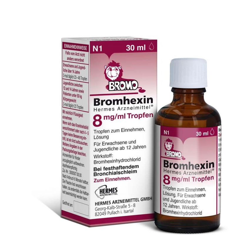 Bromhexin HERMES ARZNEIMITTEL® 8 mg/ml - лекарственный препарат в форме капель для лечения острых и хронических заболеваний бронхов и легких с вязкой мокротой. Содержит бромгексина гидрохлорид в качестве активного вещества, обладает муколитическим действием, способствует разжижению и выведению мокроты. Предназначен для взрослых и подростков старше 12 лет.