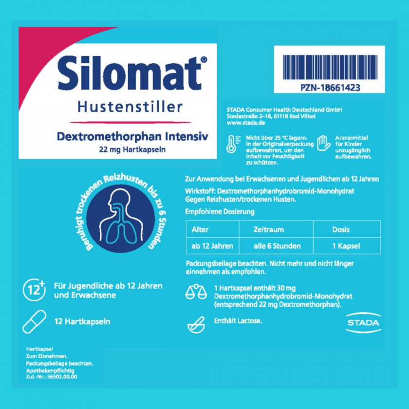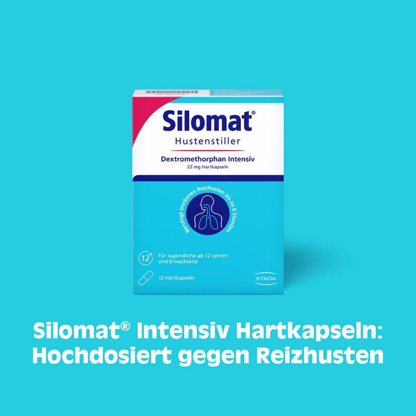 Silomat Dextromethorphan Intensiv - противокашлевые капсулы для лечения сухого рефлекторного кашля. Содержат 30 мг декстрометорфана, начинают действовать через 15-30 минут и сохраняют эффект до 6 часов. Предназначены для взрослых и подростков от 12 лет.