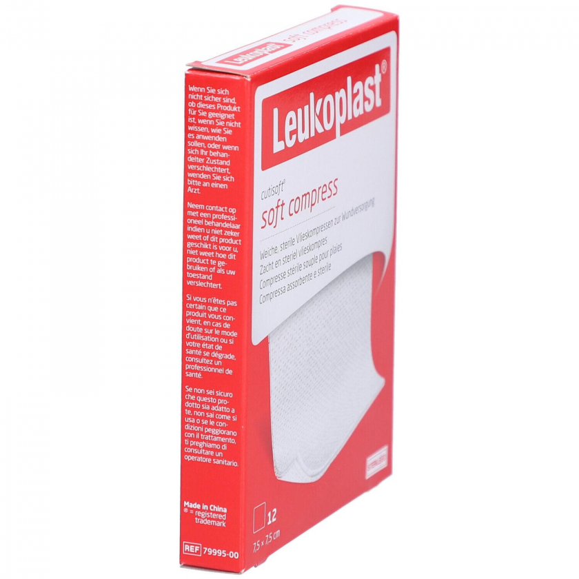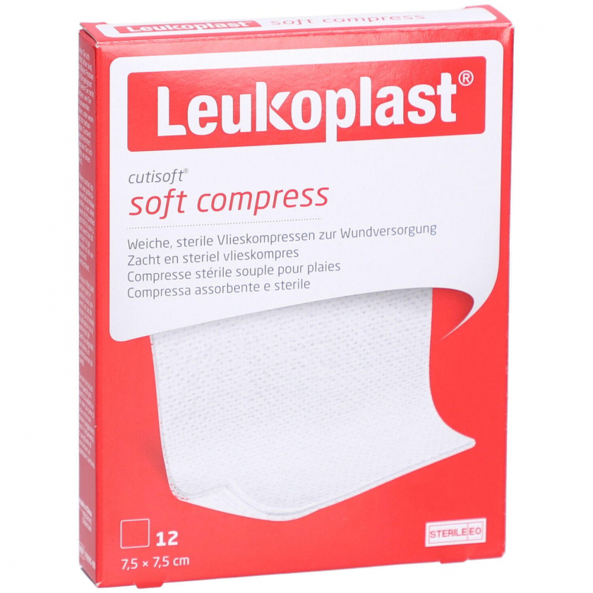 Leukoplast Cutisoft soft compress - мягкая стерильная компрессная повязка 7,5 x 7,5 см для обработки ран. Обладает высокой впитывающей способностью, мягкой текстурой, используется для очистки ран. Требует фиксации повязкой или эластичным бинтом.