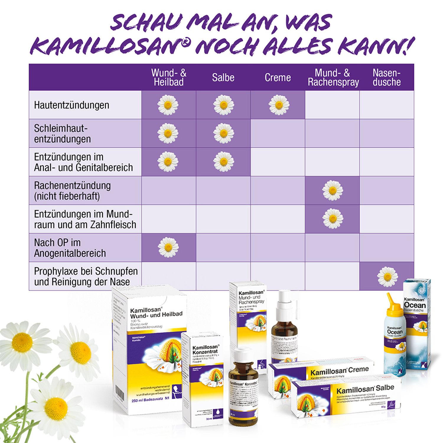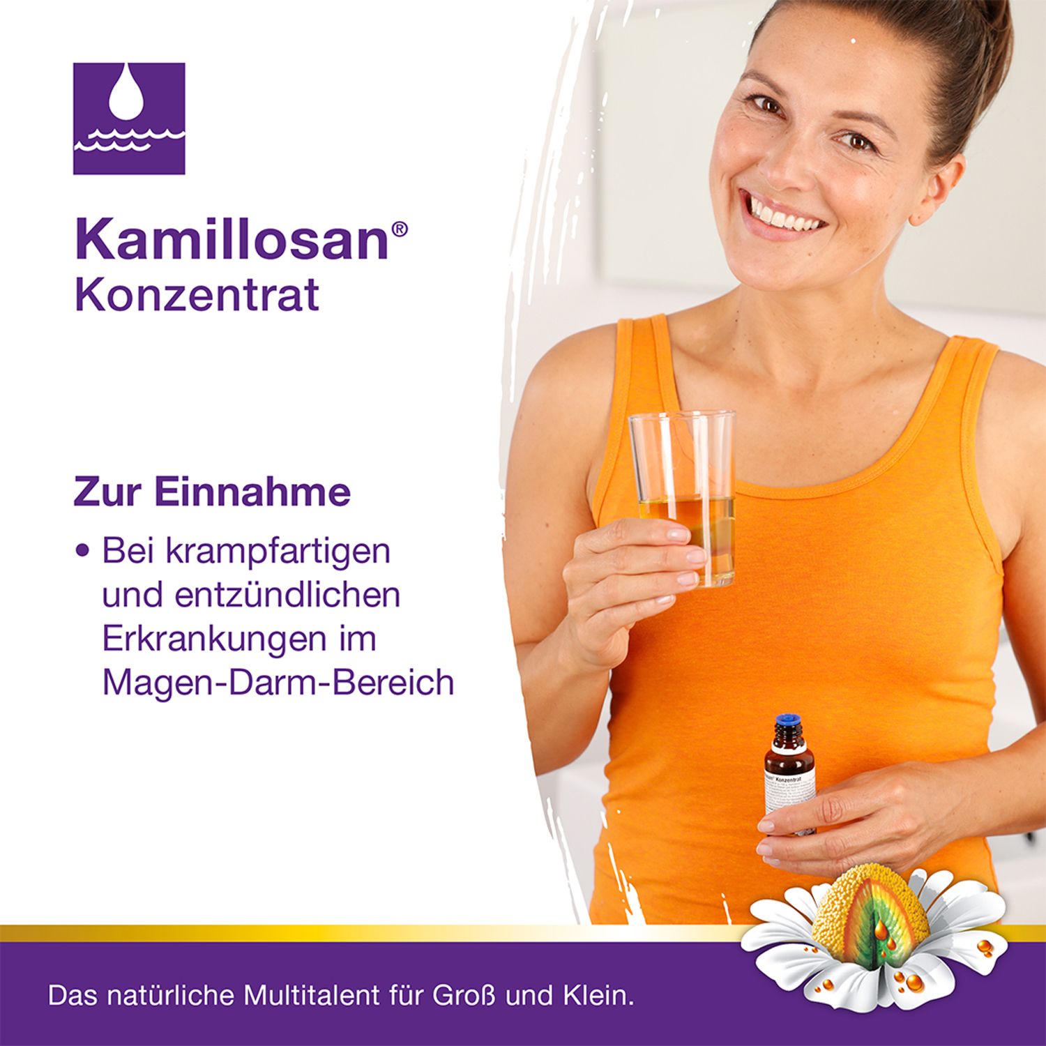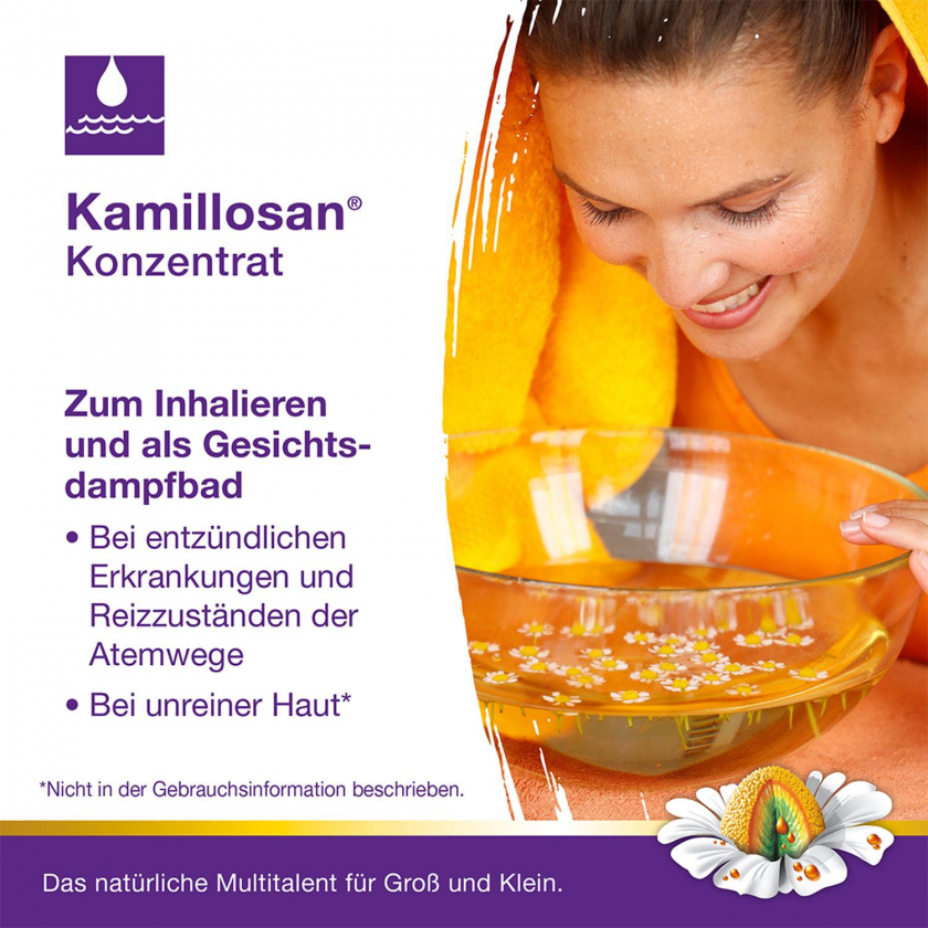 Kamillosan Konzentrat - растительное лекарственное средство на основе экстракта ромашки для внутреннего и наружного применения. Используется при воспалительных заболеваниях кожи, слизистых оболочек, дыхательных путей и желудочно-кишечного тракта. Подходит для ингаляций, полосканий, компрессов, сидячих ванн и приема внутрь.