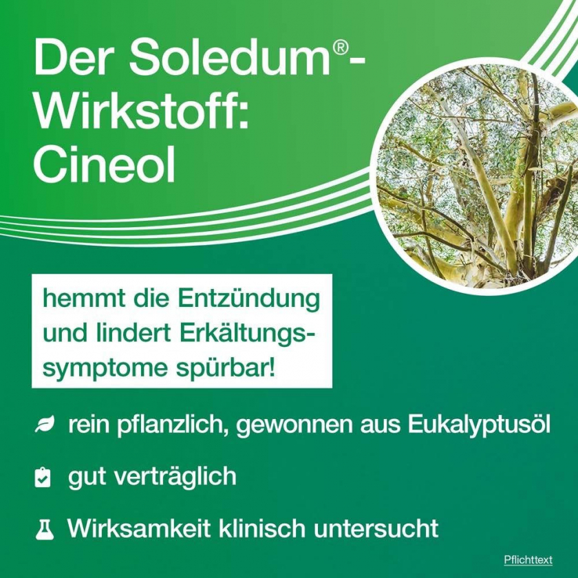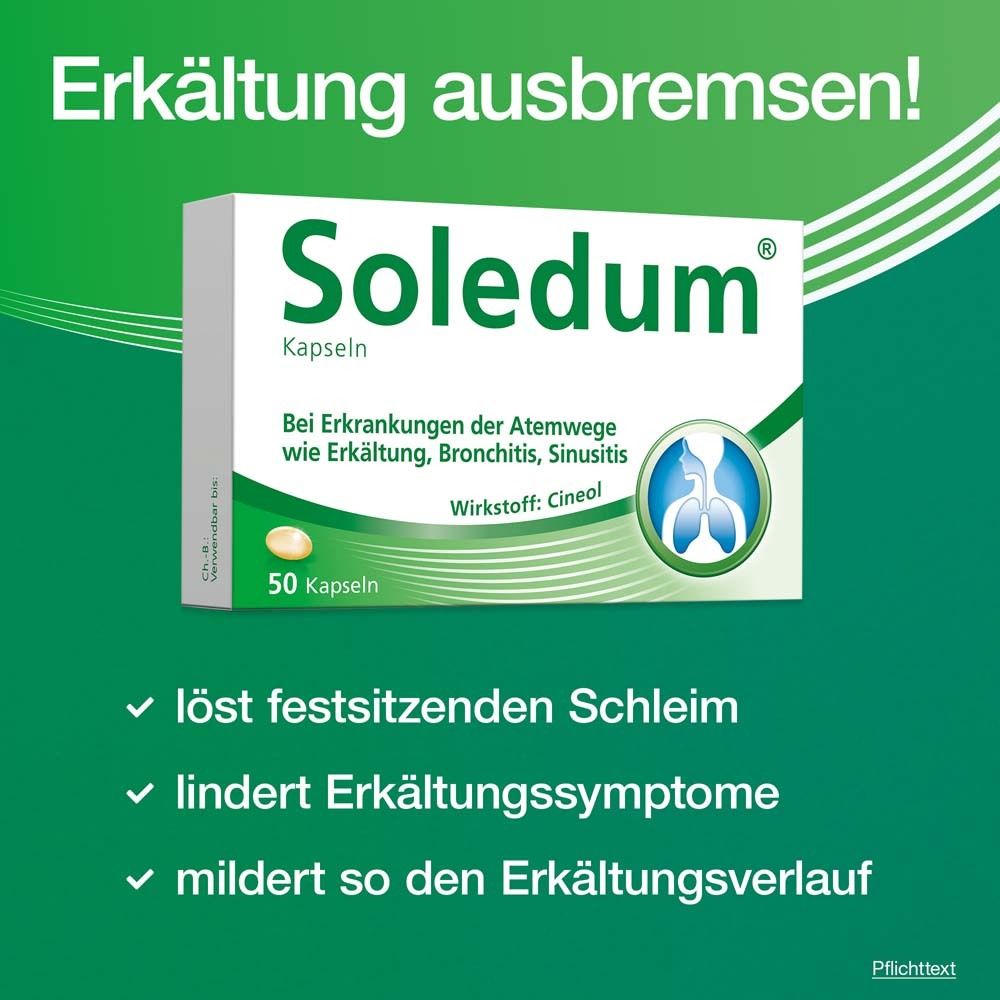 Soledum® Kapseln - лекарственный препарат на основе натурального цинеола для лечения симптомов простуды, бронхита и синусита. Обладает противовоспалительным и муколитическим действием, способствует отхождению мокроты и облегчению дыхания при заболеваниях дыхательных путей.