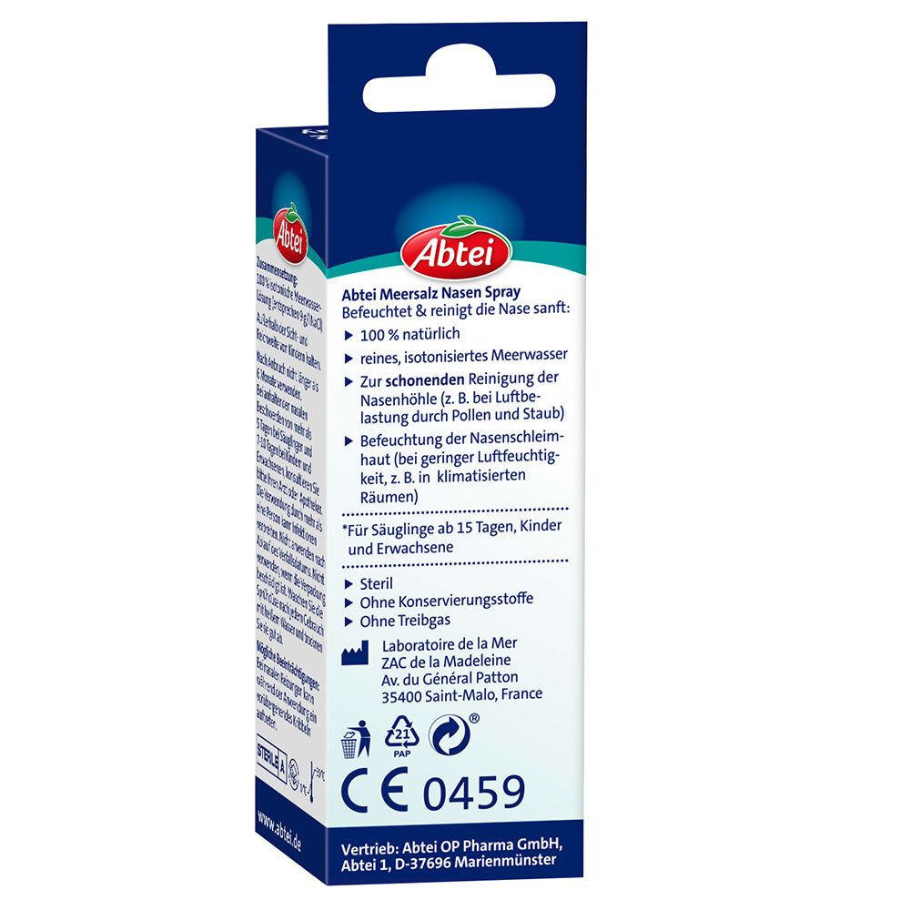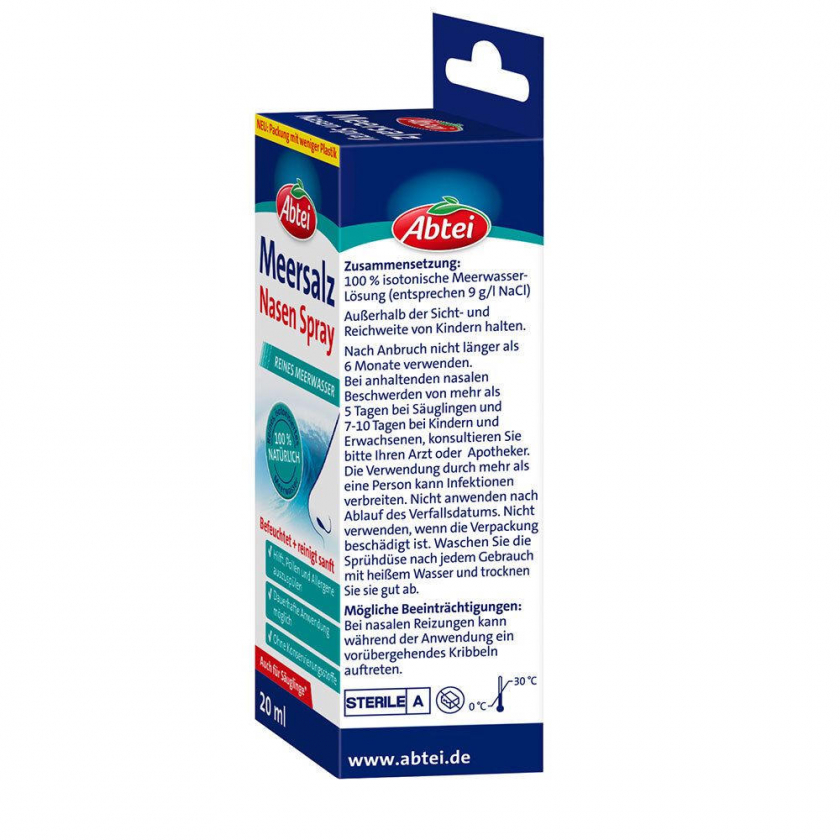 Abtei Meersalz Nasenspray - назальный спрей на основе 100% натурального изотонического морской воды для мягкого очищения и увлажнения носовой полости. Подходит для младенцев с 15 дней, детей и взрослых. Помогает вымывать пыльцу и аллергены, можно применять длительно. Стерильный раствор без консервантов.