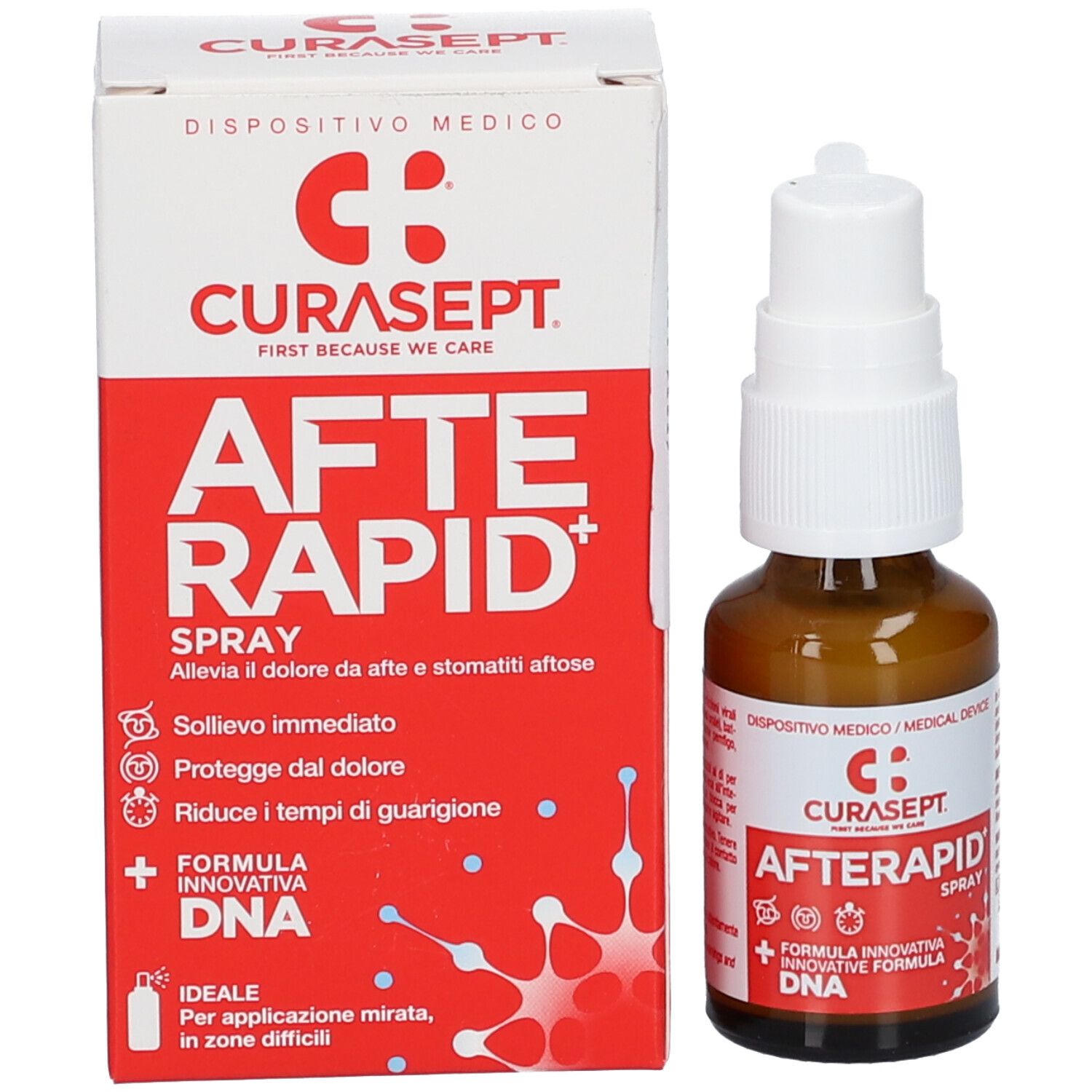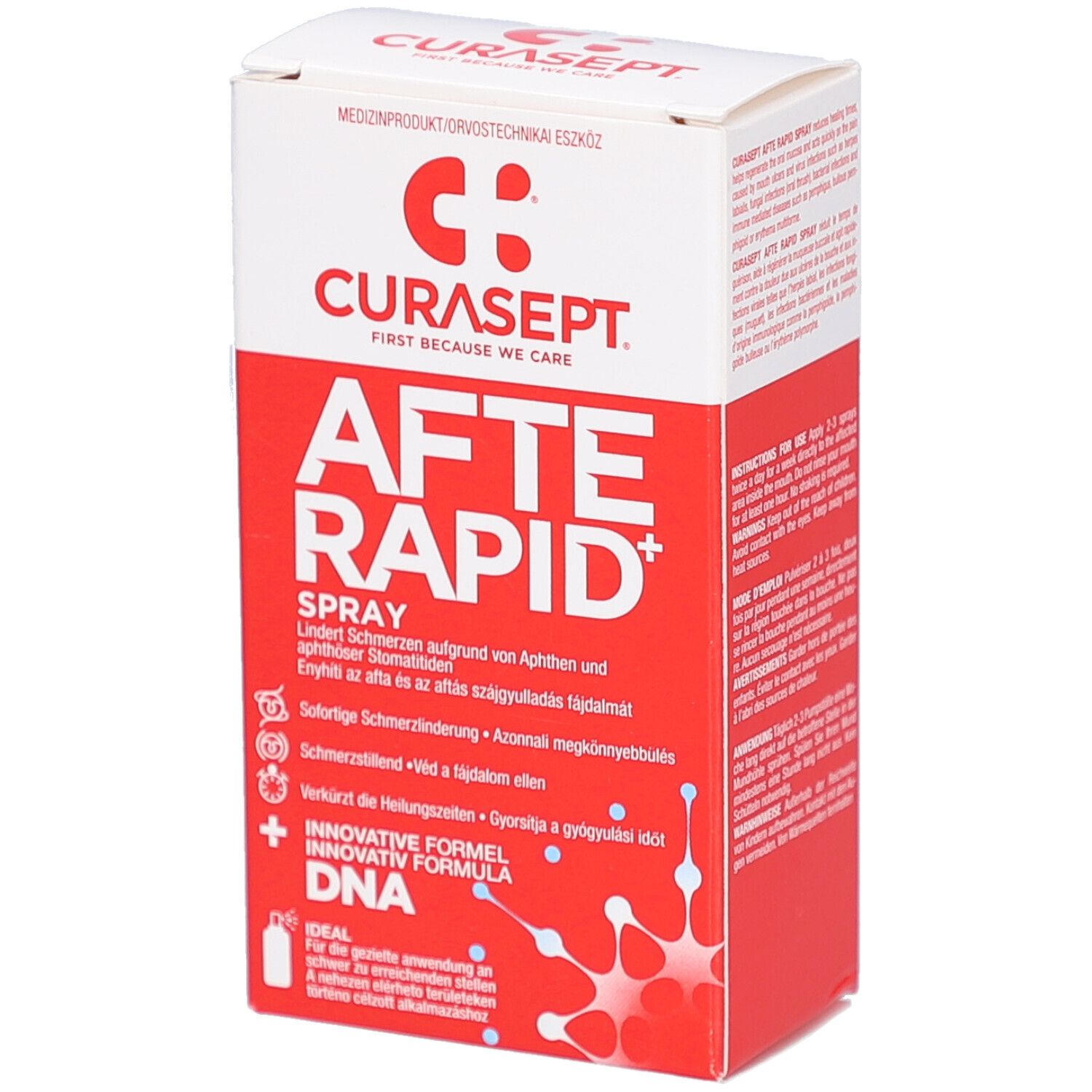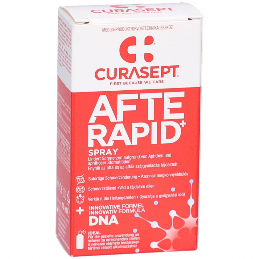 CURASEPT® AFTERAPID DNA Spray - спрей для лечения болезненных воспалений слизистой оболочки рта и афт. Содержит ДНК и гиалуроновую кислоту для ускорения заживления, регенерации тканей и быстрого обезболивания. Идеален для обработки труднодоступных участков.