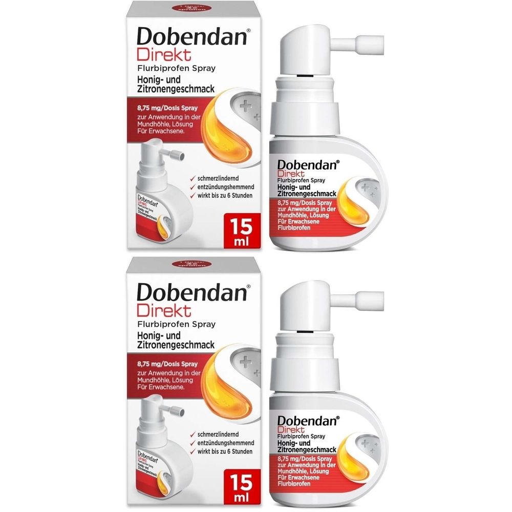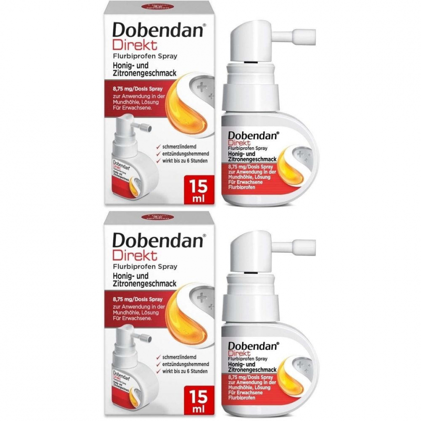 Dobendan Direkt Spray - лекарственный спрей от сильной боли в горле с флурбипрофеном. Обеспечивает до 6 часов обезболивающего и противовоспалительного действия, начинает действовать через 5 минут. Без антибиотиков, алкоголя и сахара, с медово-лимонным вкусом. Подходит для взрослых от 18 лет.
