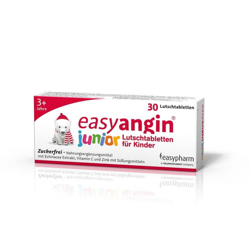 Easyangin Junior - леденцы для рассасывания для детей от 3 лет при дискомфорте в горле и для поддержки иммунитета. Содержат экстракт эхинацеи, цинк, витамин C и ментол с приятным клубничным вкусом. Упаковка 30 таблеток.