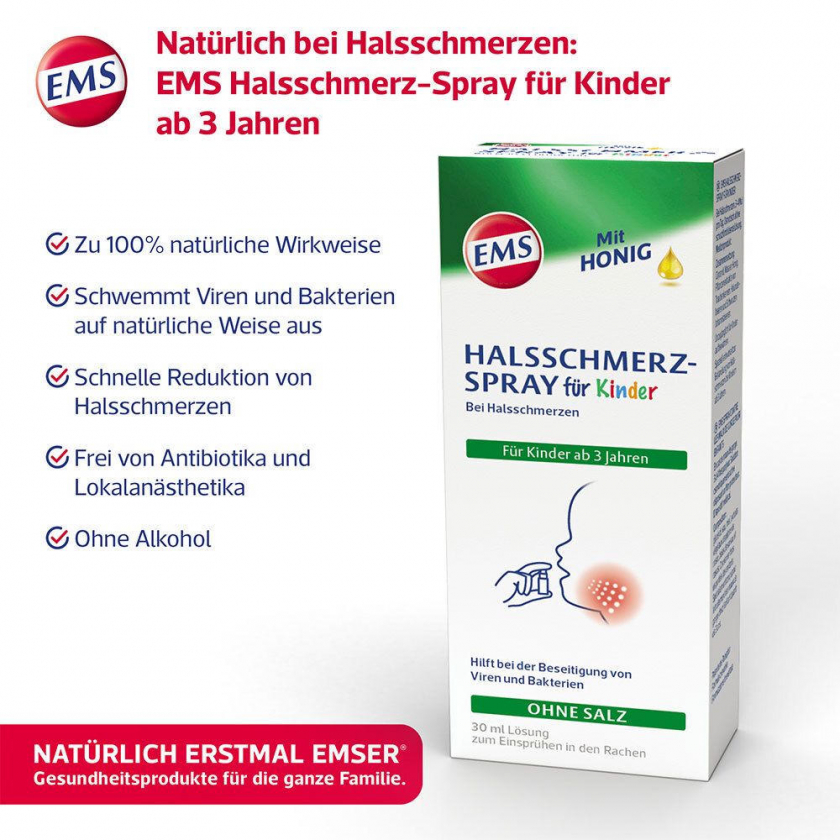 EMS Halsschmerz-Spray для детей - спрей от боли в горле для детей от 3 лет. Содержит натуральные компоненты: экстракты бузины, черной смородины, виноградных косточек и мед. Образует защитную пленку, увлажняет слизистую, вымывает вирусы и бактерии, уменьшает боль. Безопасный состав с приятным вкусом.