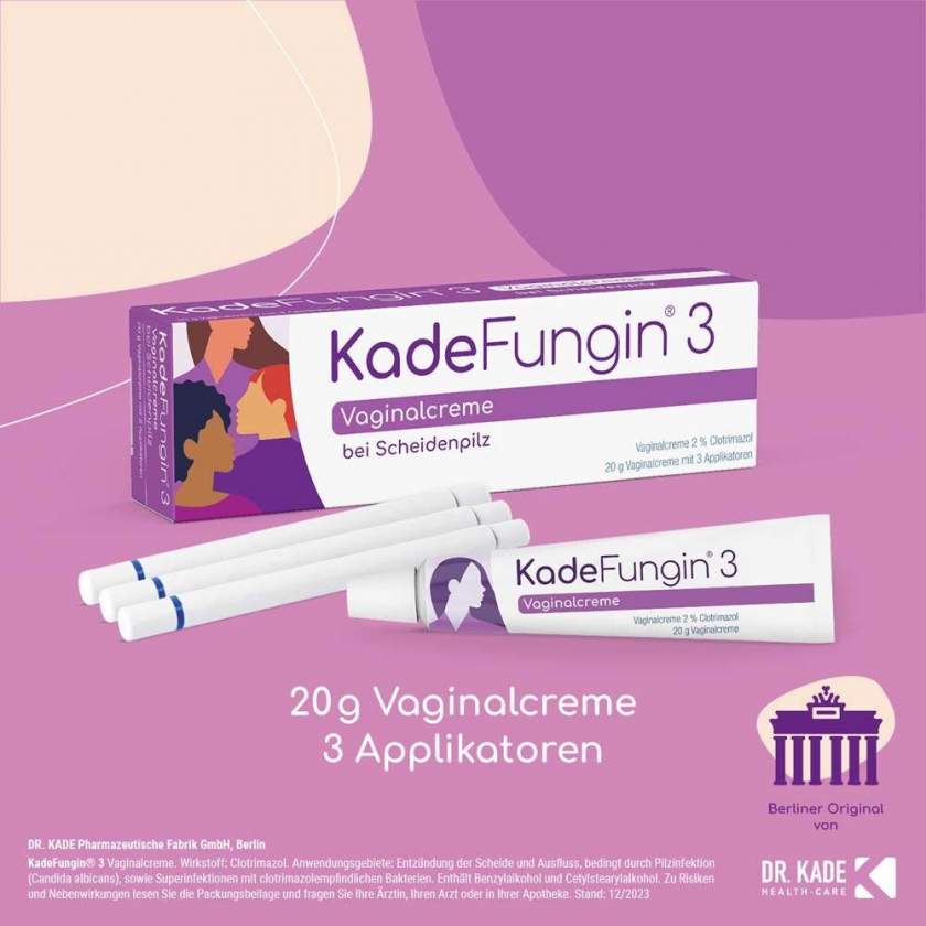 KadeFungin 3 Vaginalcreme - противогрибковый препарат для лечения вагинальных инфекций, вызванных дрожжевыми грибками. Содержит клотримазол, применяется вагинально с помощью аппликатора в течение 3 дней. Особенно подходит для женщин с сухостью влагалища.
