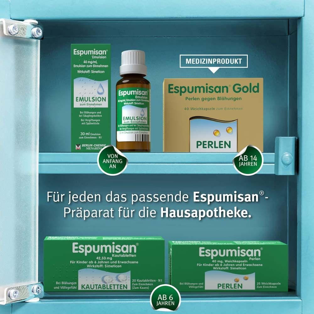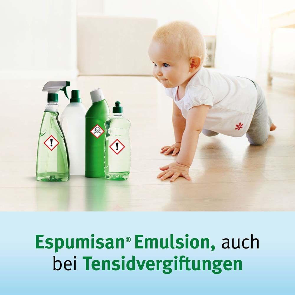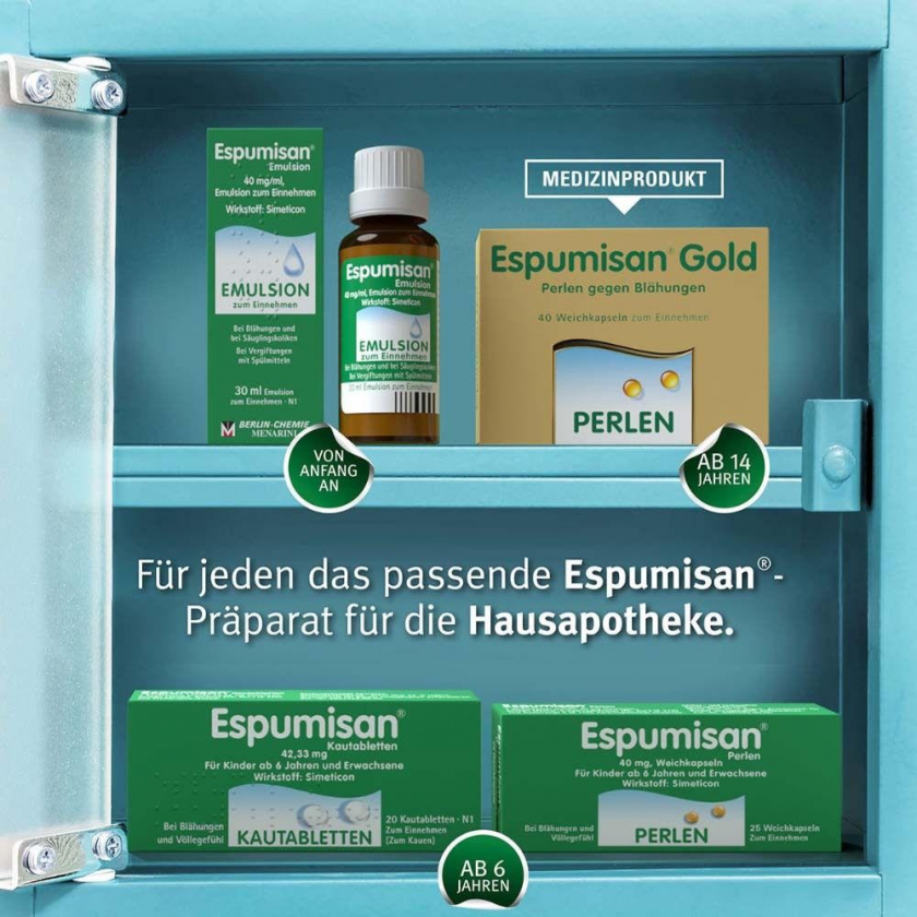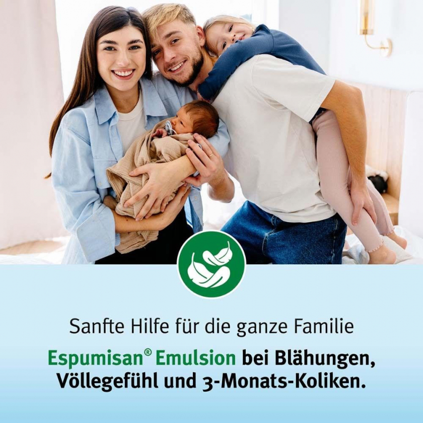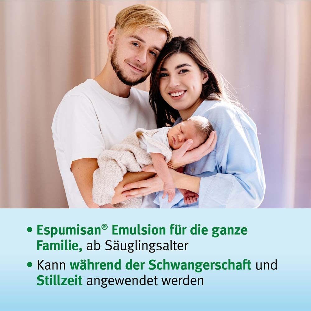 Espumisan® Emulsion - лекарственное средство на основе симетикона для лечения газообразования, вздутия живота и колик у младенцев. Подходит для всех возрастных групп, включая новорожденных, детей и взрослых. Не содержит алкоголь, сахар, ароматизаторы, красители и лактозу. Может применяться при беременности и грудном вскармливании.