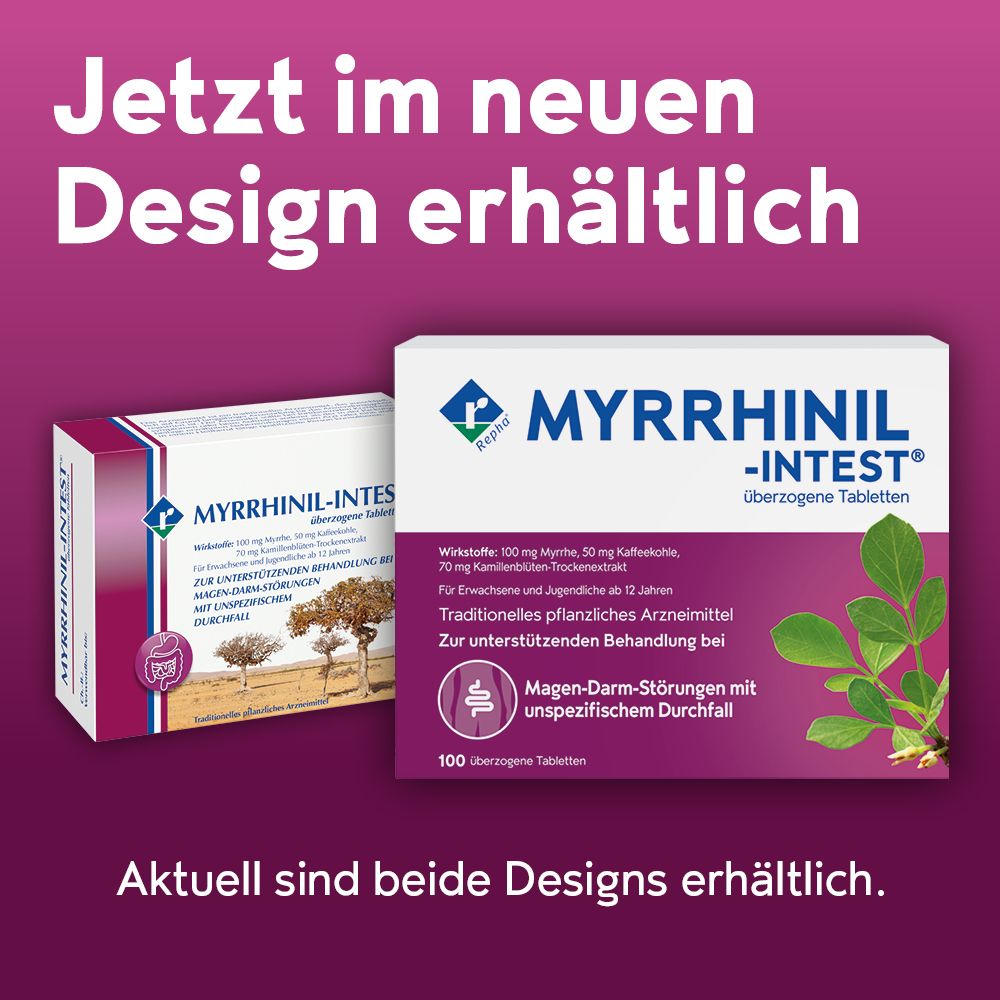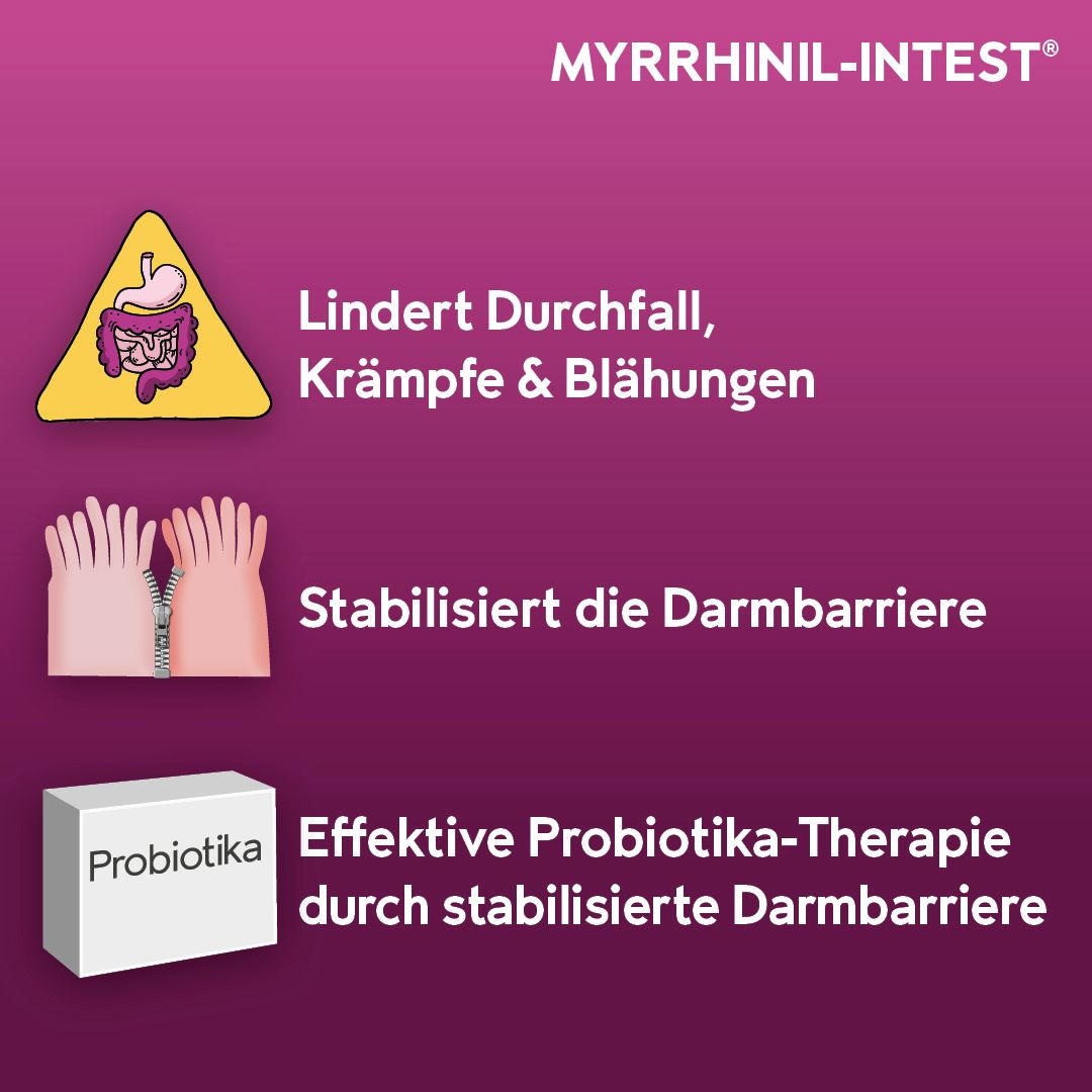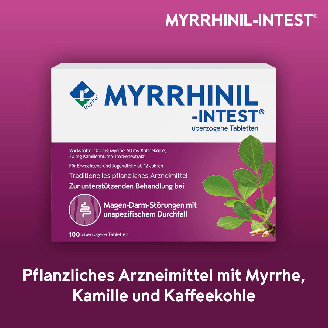 MYRRHINIL-INTEST® - традиционное растительное лекарственное средство для поддерживающего лечения желудочно-кишечных расстройств с неспецифической диареей, сопровождающейся легкими спазмами и вздутием живота. Содержит уникальную комбинацию мирры, ромашки и кофейного угля, которые оказывают противовоспалительное, спазмолитическое и абсорбирующее действие. Подходит для взрослых и подростков от 12 лет.