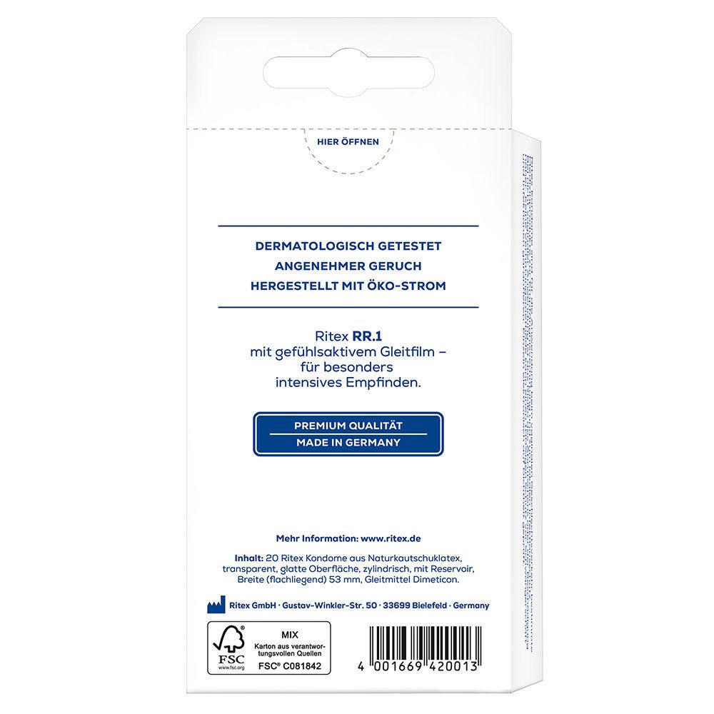 Ritex RR.1 - премиальные кондомы из натурального латекса производства Германии. Обеспечивают контрацепцию и защиту от ИППП. Имеют ультратонкую структуру, гладкую поверхность с активирующим чувствительность смазочным покрытием для интенсивных ощущений. Дерматологически протестированы, гипоаллергенны, производятся с использованием экологически чистой энергии.
