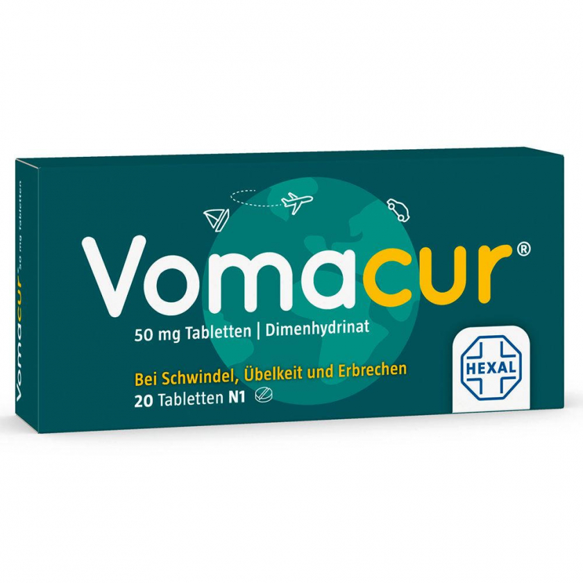 Vomacur® 50 mg - лекарственный препарат для профилактики и лечения укачивания, тошноты, головокружения и рвоты. Содержит дименгидринат - антигистаминный препарат, блокирующий рвотный центр в мозге. Подходит для взрослых и детей от 6 лет с массой тела более 30 кг. Производитель Hexal AG, Германия.