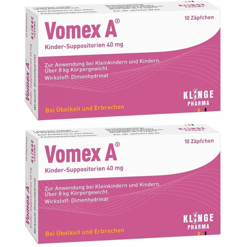 Vomex A® 40 mg детские суппозитории - лекарственное средство для профилактики и лечения тошноты и рвоты у детей от 8 кг. Содержит дименгидринат, блокирующий гистаминовые рецепторы. Применяется ректально в дозировке, зависящей от веса ребенка.