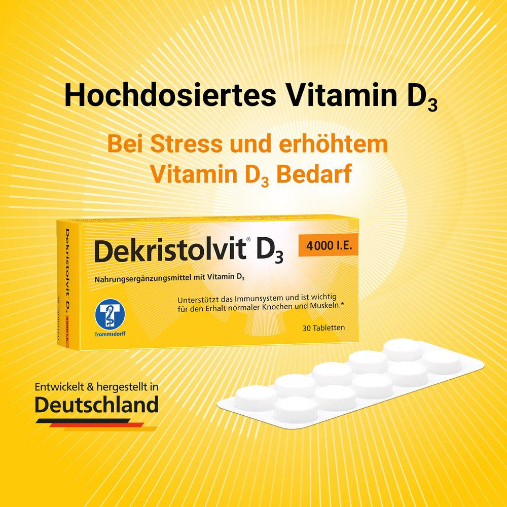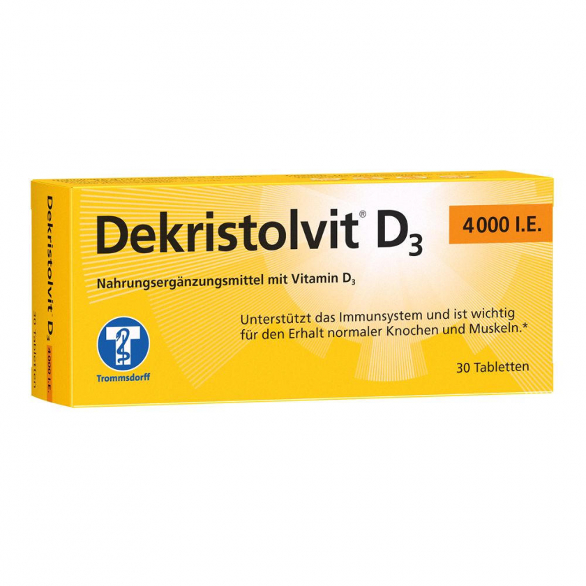 Dekristolvit D3 4000 I.E. - витаминная добавка с высокой дозировкой витамина D3 для поддержки иммунной системы, укрепления костей и мышц. Подходит для взрослых и детей от 11 лет. Произведено в Германии, без глютена, лактозы, фруктозы и желатина.