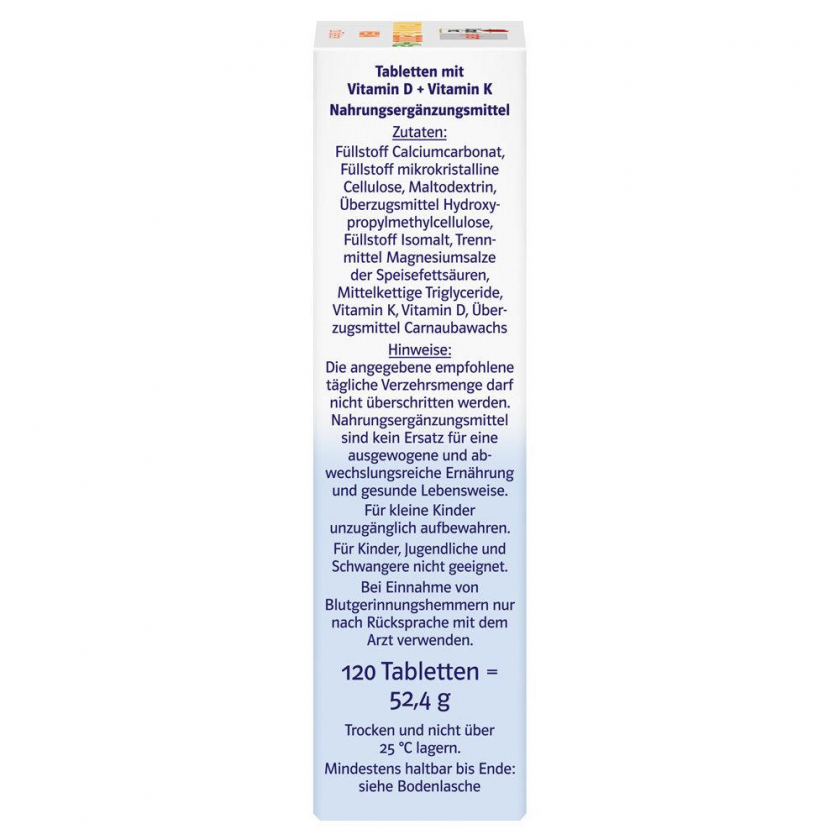 Состав: Карбонат кальция, микрокристаллическая целлюлоза, мальтодекстрин, гидроксипропилметилцеллюлоза, изомальт, соли магния жирных кислот, среднецепочечные триглицериды, менахинон (витамин K2), холекальциферол (витамин D3), карнаубский воск