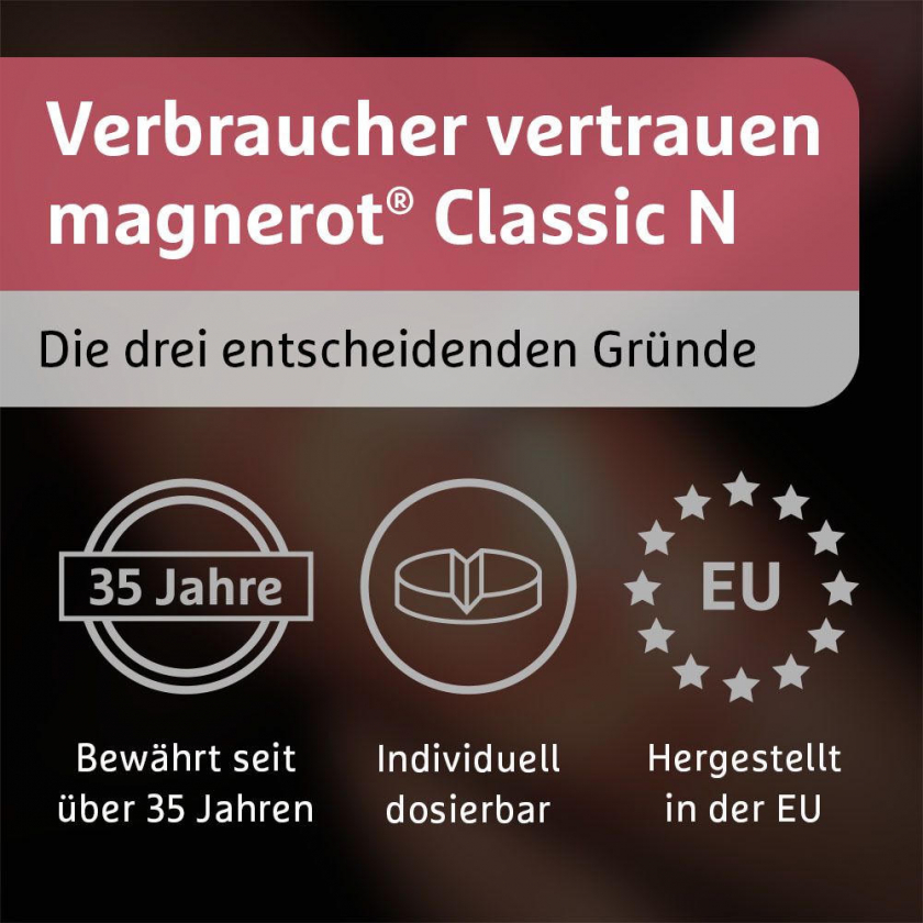 Magnerot CLASSIC N - лекарственный препарат магния для лечения и профилактики дефицита магния. Содержит органическую форму магния (магния оротат), которая хорошо усваивается организмом. Применяется при мышечных судорогах, повышенной потребности в магнии у спортсменов, при стрессе, нарушениях сна и других симптомах дефицита магния.