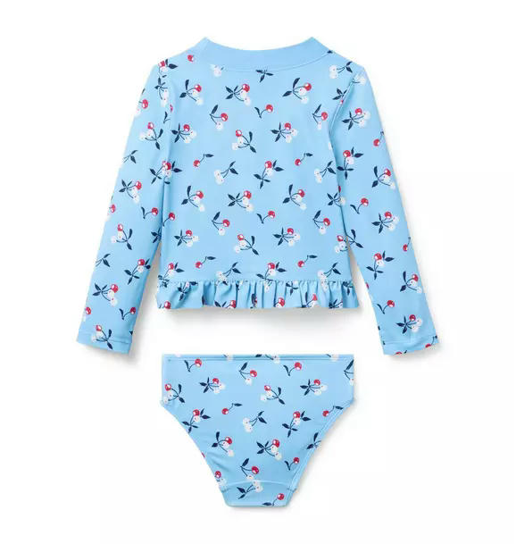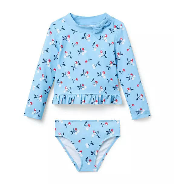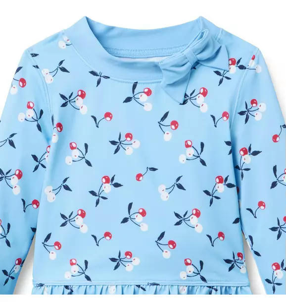 Sweet style for fun in the sun. Our rash guard set has them covered with an allover cherry print, ruffle peplum and bow detail. Plus, UPF 50+ sun protection to keep them stylishly safe. Responsibly made with recycled polyester fabric.
