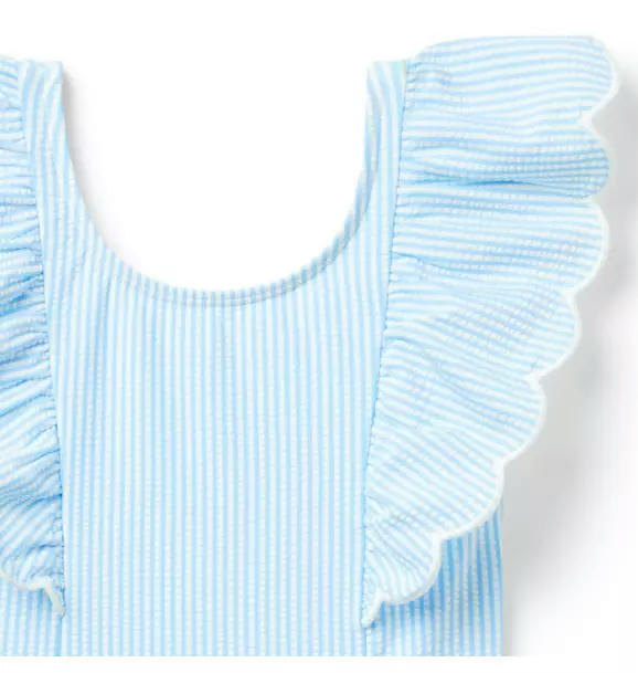 Catch a wave in retro-inspired striped seersucker. Our swimsuit features a ruffle detail, scalloped trim and scoop back. Responsibly made with recycled polyester fabric, with UPF 50+ sun protection to help keep them stylishly safe.