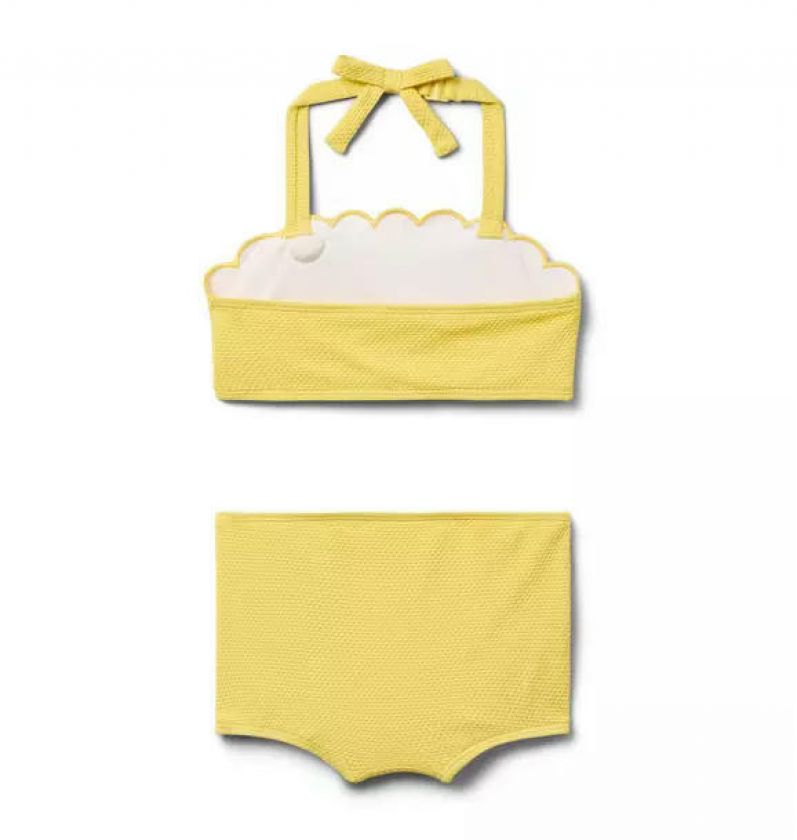 Our textured two-piece swimsuit is a splash of sunshine with a scalloped neck and button details. Finished with a rosette and UPF 50+ sun protection to help keep them stylishly safe. Responsibly made with recycled nylon fabric.