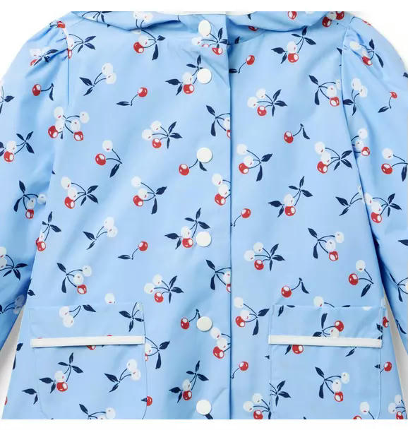 Our favorite pick for a fashionable forecast. With an allover cherry print, hooded silhouette and pockets too, our raincoat is ready for any adventure.