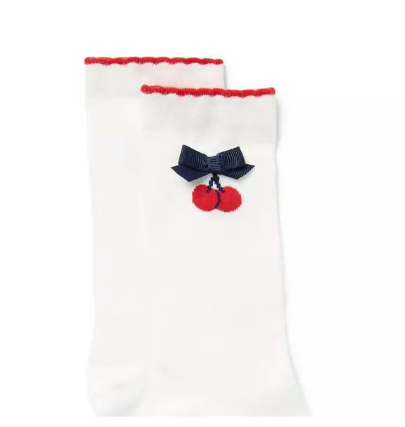 Add sweet style to any look with our sock featuring an intarsia-knit cherry detail, bow applique and scalloped cuff. Made in a soft and stretchy cotton-nylon blend for all-day comfort.