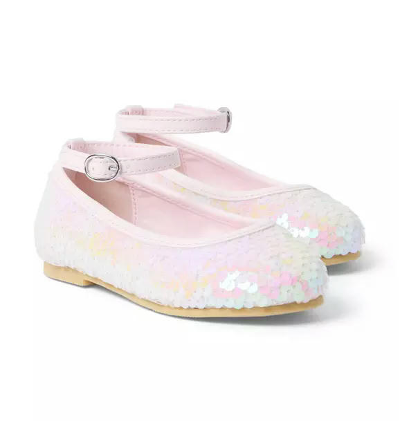 Every step sparkles with our ballet flat designed with allover sequins. Finished with a buckle ankle strap.