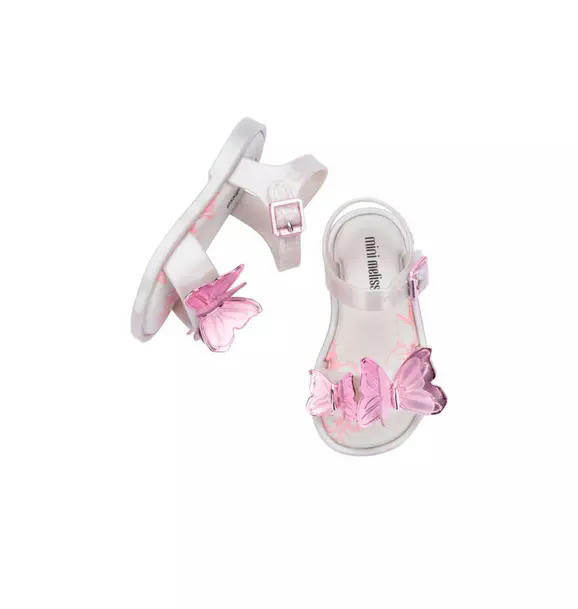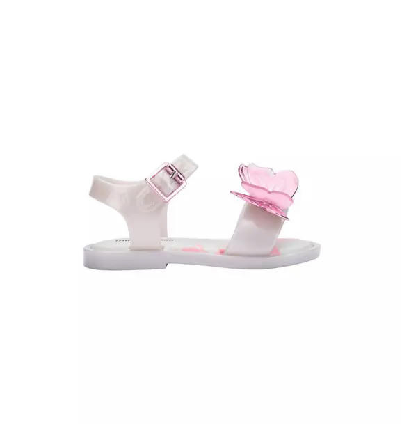 Give your little some wings to fly. Introducing the Mini Melissa Fly Sandal. This classic sandal is decorated with a layered butterfly appliqué as a reminder to your mini that she can fly as high as she wants.