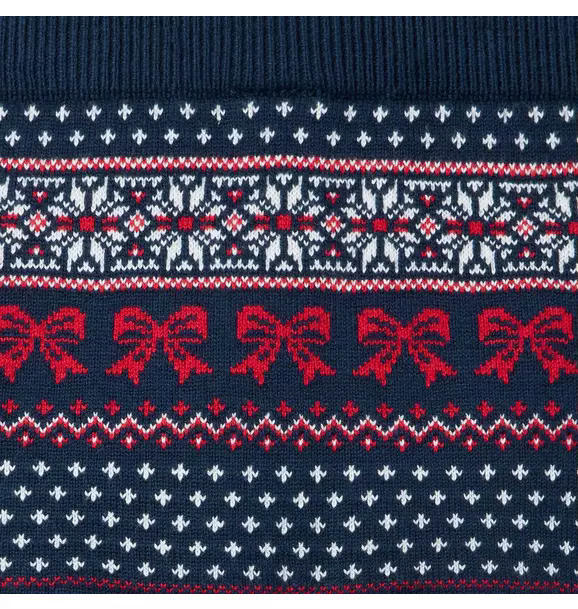 Our cozy sweater skirt is just right for twirling through the season. With an allover Fair Isle bow design, ribbed ruffle hem and contrast scalloped trim.