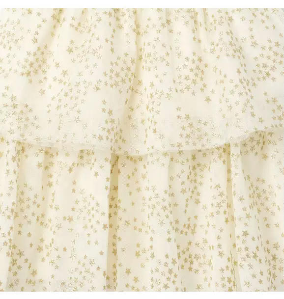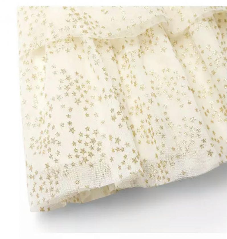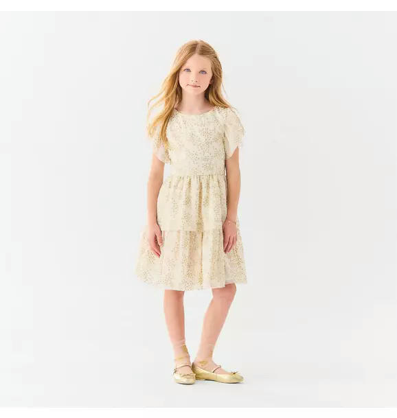 A fashionable moment is written in the stars. Our limited-edition dress features sparkling star tulle, flutter sleeves and tiered ruffles. Made to match with their favorite American Girl Doll.