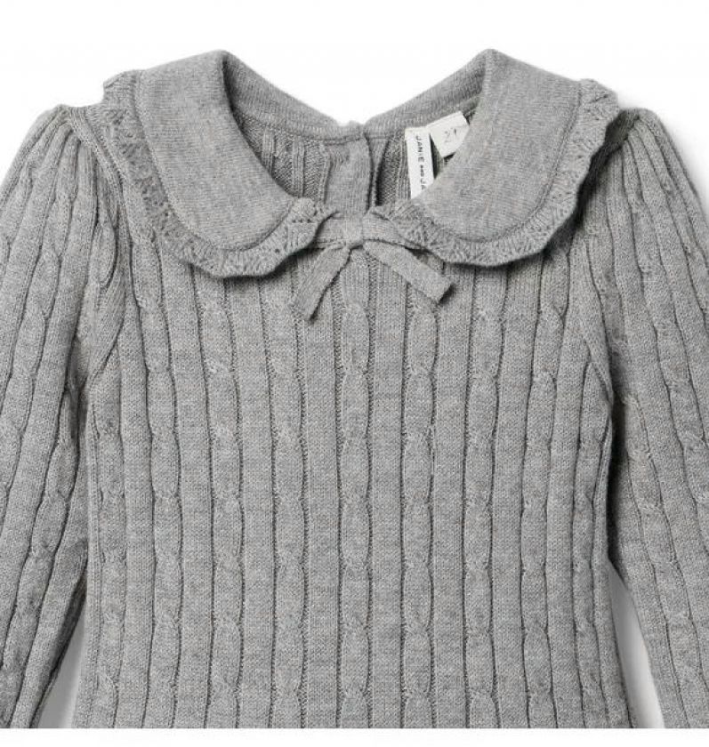 Cozy cable knit to wear all season long. Our sweater dress features a pleated skirt, a crochet-trimmed collar and ruffle cuffs. Plus a bow detail, just for fun.