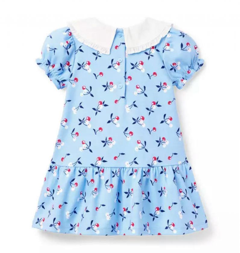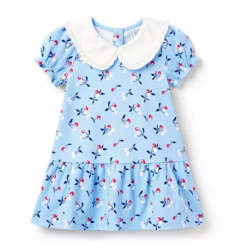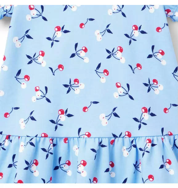 The freshest details for our dropwaist dress. Designed in soft ponte with a cherry print, puff sleeves and ruffle cuffs, plus a ruffle-trimmed collar.