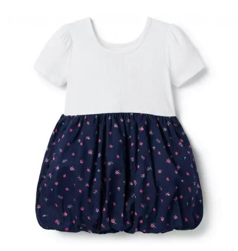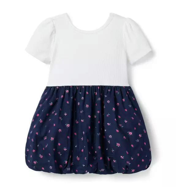 The perfect pick to dress up or down. Featuring a ribbed top and a trendsetting bubble hem with allover ditsy florals.