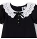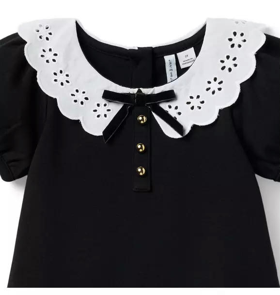 A classic with all our favorite finishes. This ponte dress features puff sleeves, an eyelet lace collar and a bow at the neck. A stylish dropwaist silhouette keeps things extra chic.