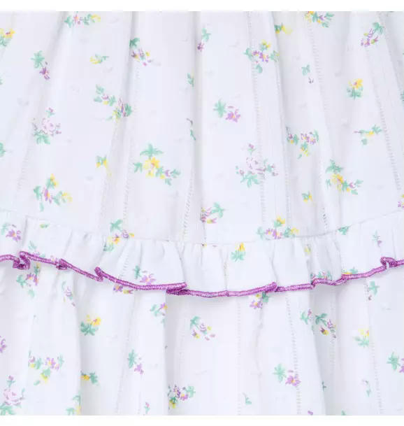 Blue skies and fresh florals ahead. Our dress in pure Swiss dot cotton is a favorite with its ruffles, picot trim and bows at the straps.