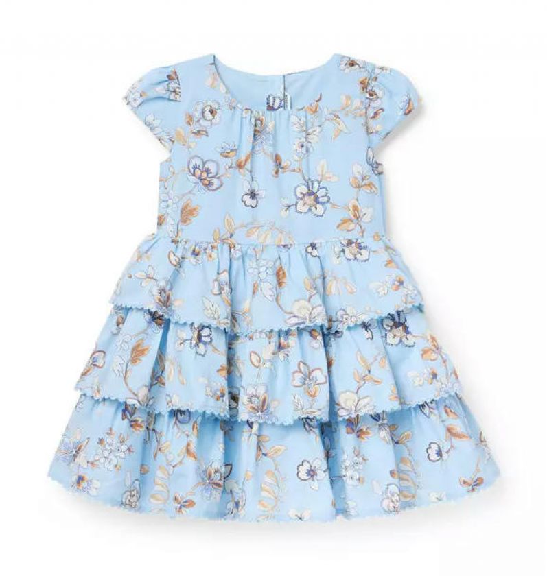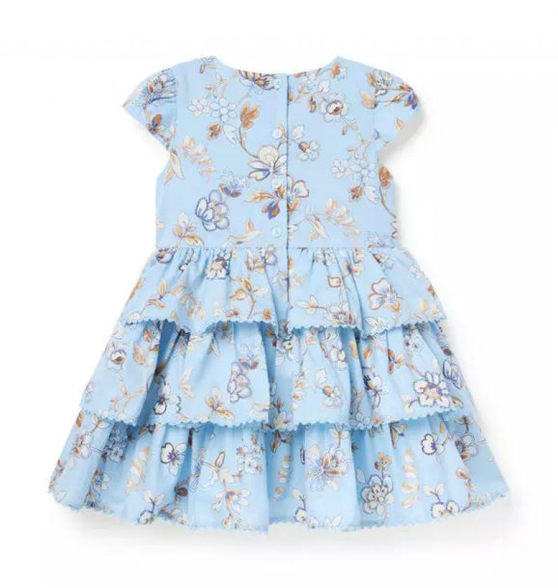 It’s a season of style in our pure cotton dress. Designed with allover florals, tiered ruffles and crochet lace trim.