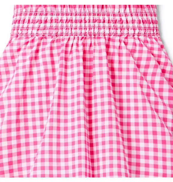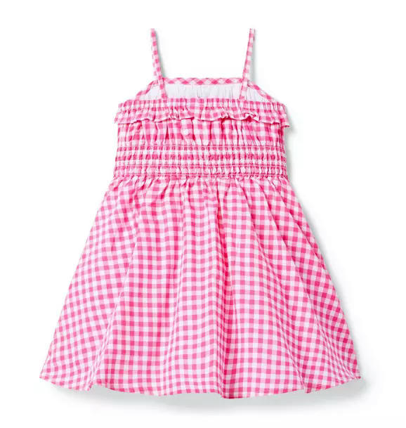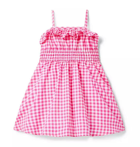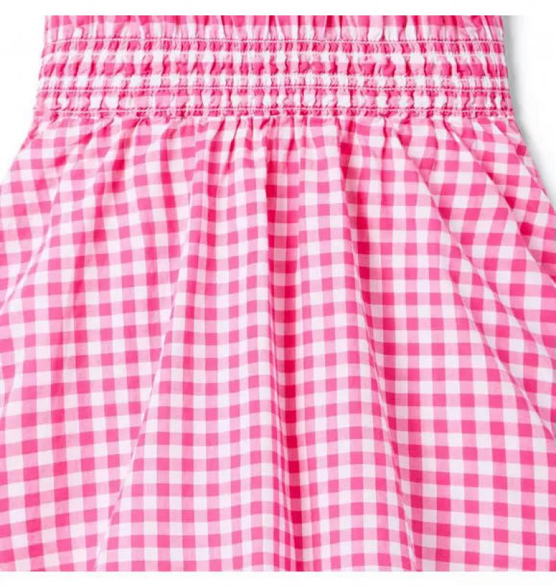 Our dress in gingham seersucker checks every style box. With a ruffle at the neck and a smocked waist too.