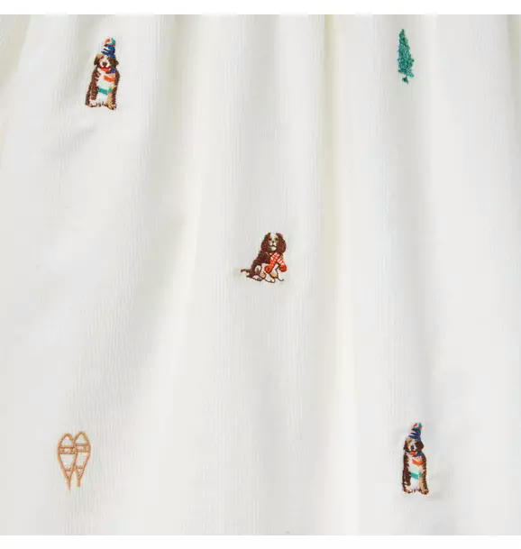For cozy moments with fur-ever friends, our limited edition dress is the one to love. Designed with allover embroidered dogs and a bow detail at the collar.