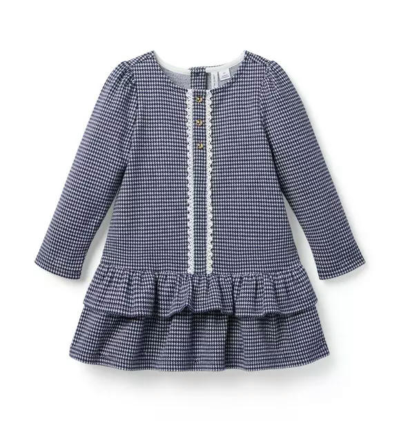 Timeless houndstooth, tailored to perfection. Our soft jacquard dress features a dropwaist silhouette and tiered ruffles, plus lace trim and gold-tone button details.