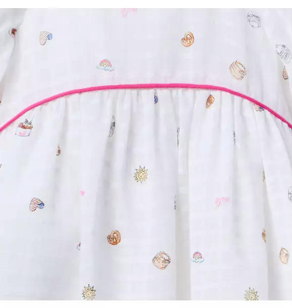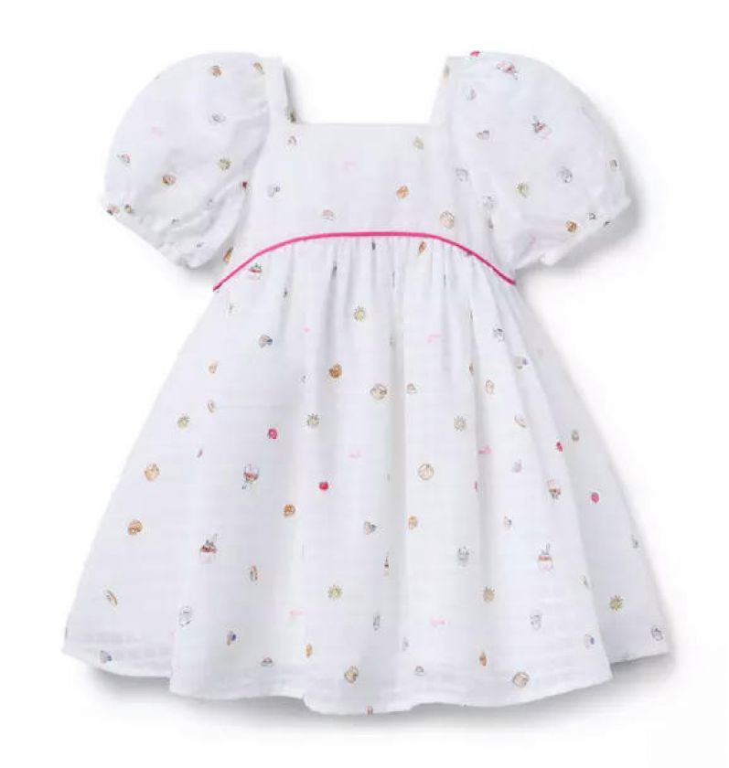 A look that takes the cake, inspired by NYC's iconic Milk Bar sweet shop. Our empire waist dress in pure cotton features an exclusive print, puff sleeves and a piped detail at the waist.