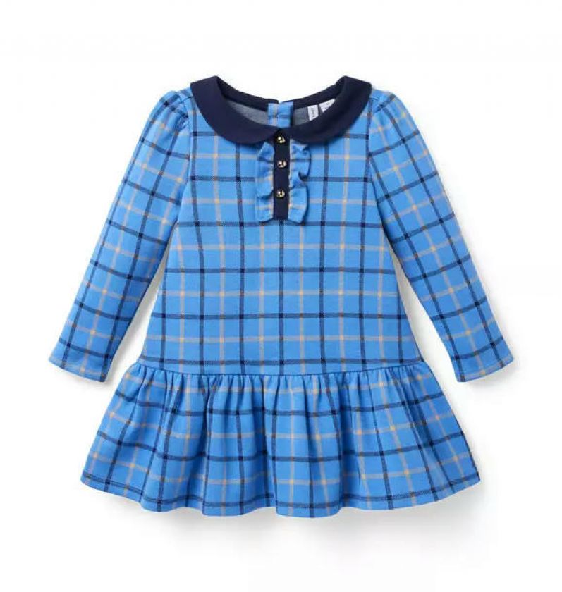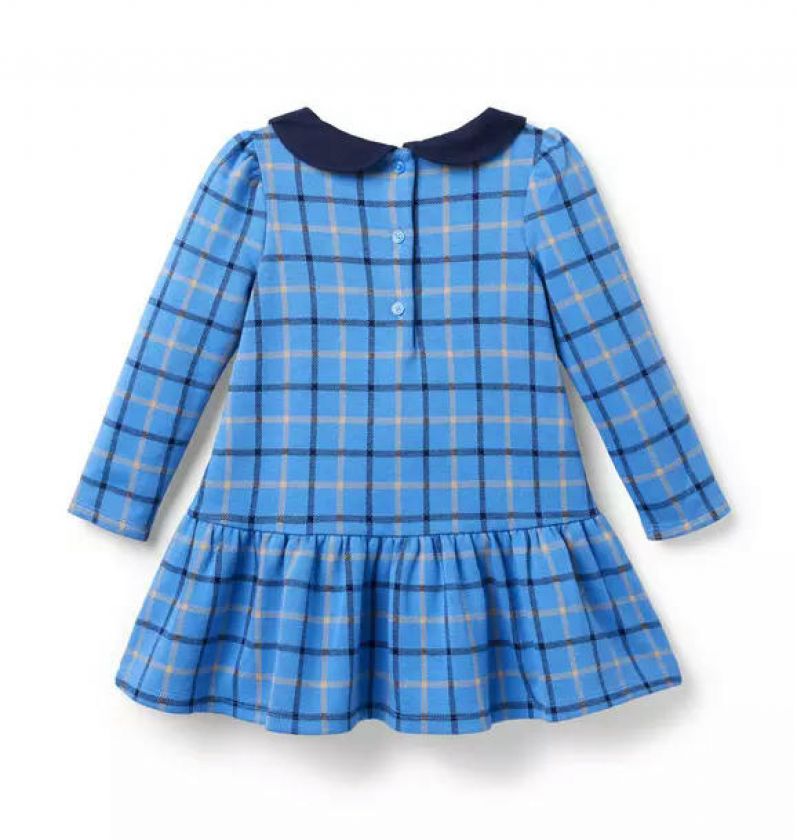 We're mad about plaid, and this dropwaist dress is no exception. In soft jacquard with a contrast Peter Pan collar, ruffle trim and gold-tone button details.